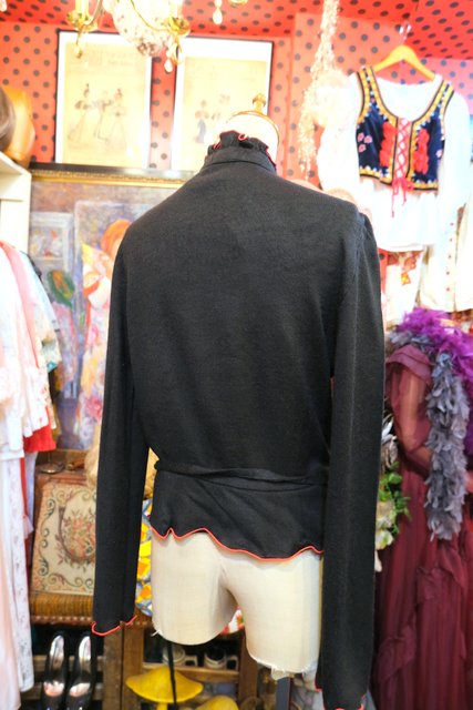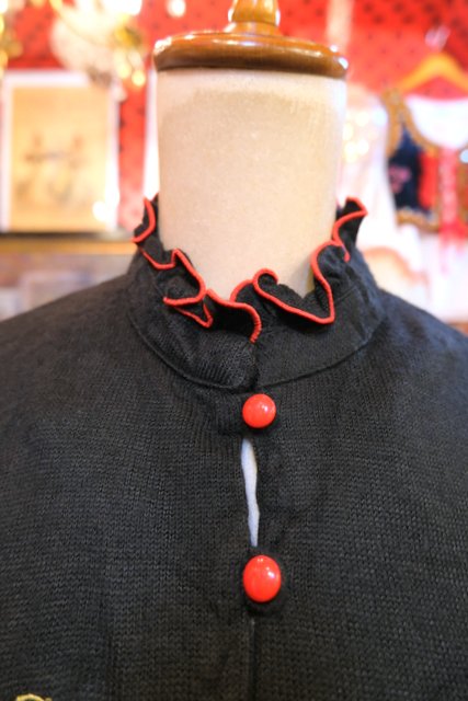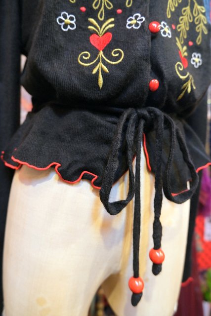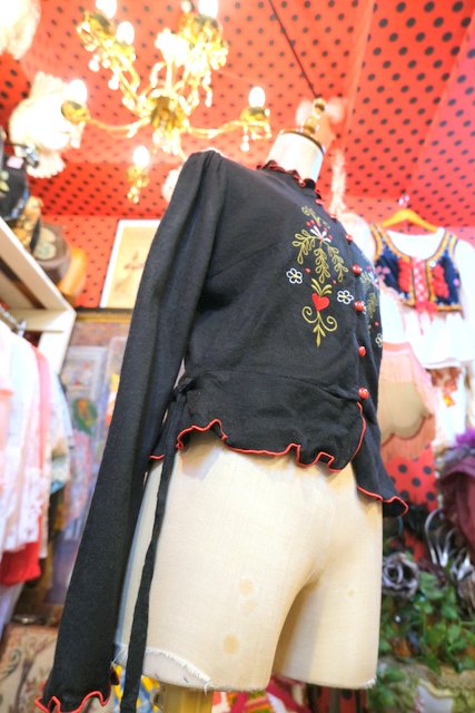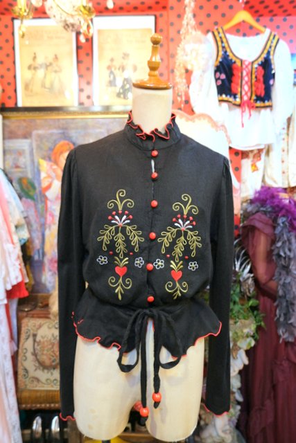 お花やハートの刺繍に赤いフリルパイピングや腰ひも付きが魅力的な1970年代頃の旧西ドイツ製ヴィンテージブラウス