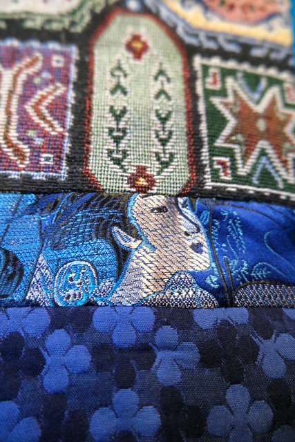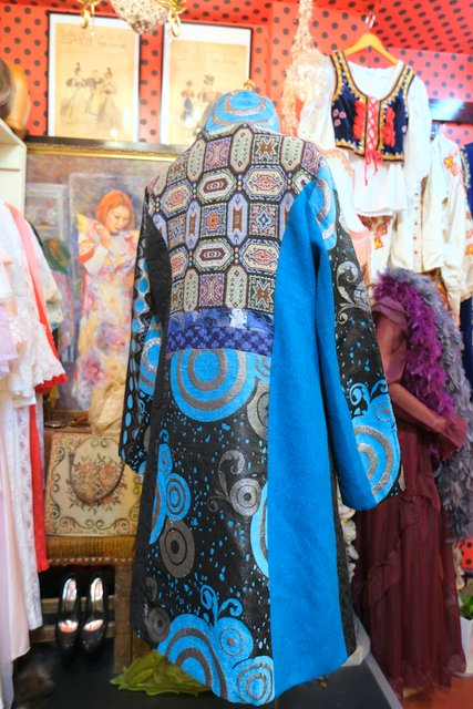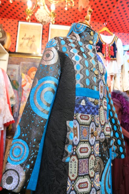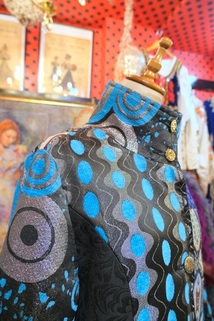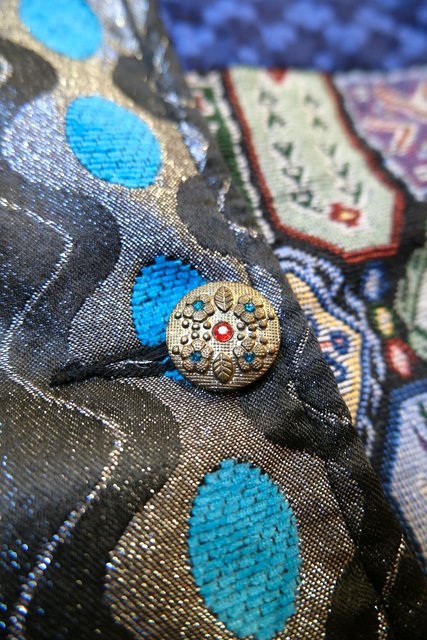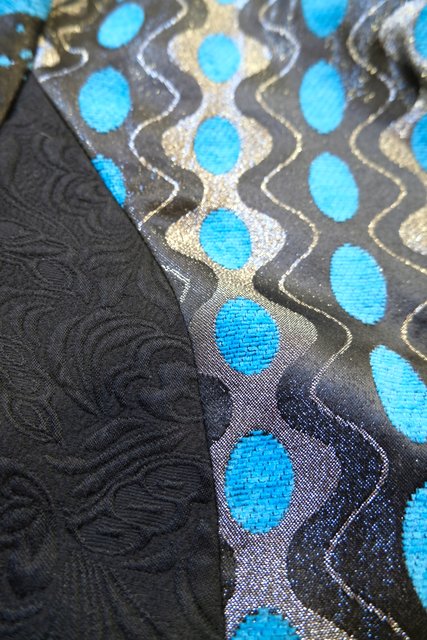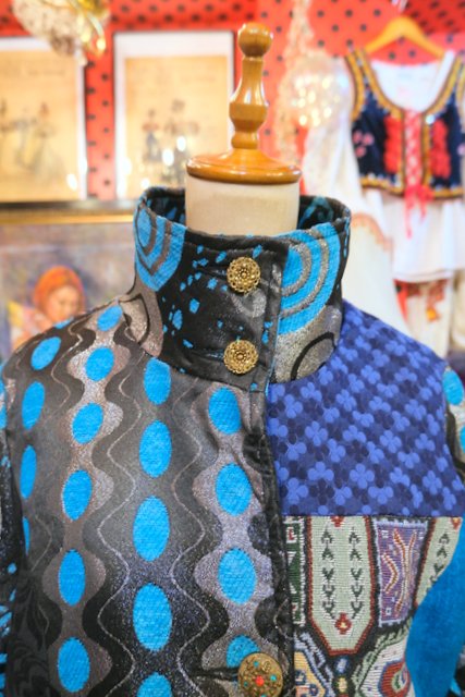 クールな印象のスタンドカラーにメタリックなサイケデリック模様や浮世絵生地、モダンな花柄、レトロなゴブラン織りなど異素材パッチワークデザインが魅力的なフランスで見つけたヴィンテージ個性的デザインコート