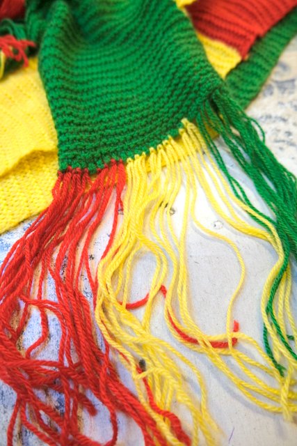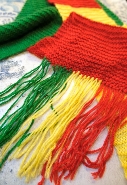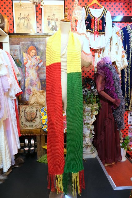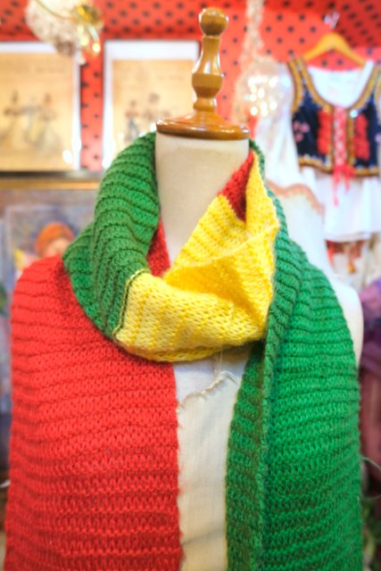 カラフルポップな赤×グリーン×黄色のロングデザインが可愛らしいヨーロピアンハンドメイドマフラー