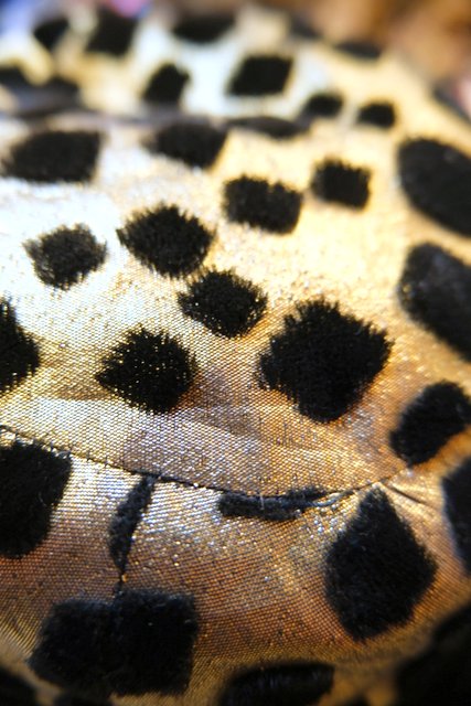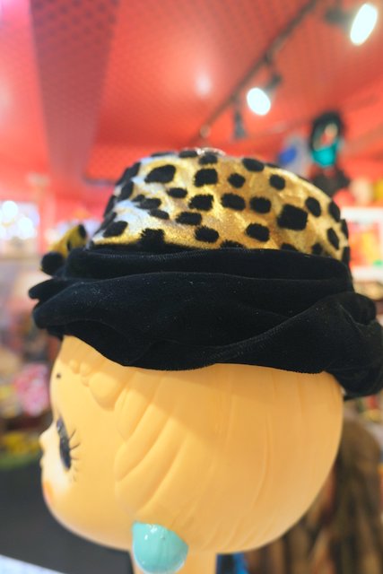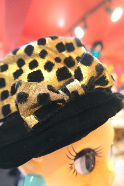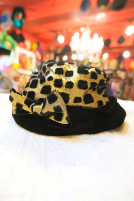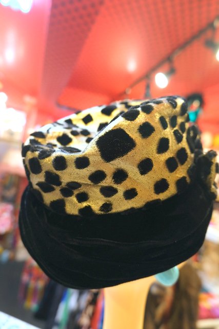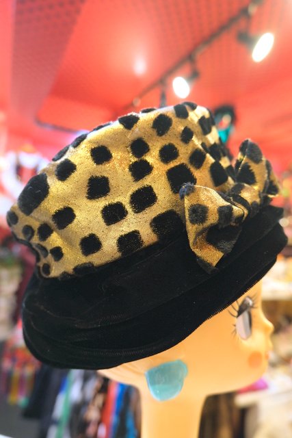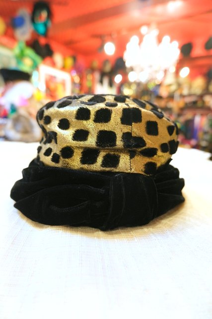 上品な印象の黒ベルベットにレオパード柄のようなゴールド×黒フロッキー加工が魅力的なスペインで見つけた1950年代頃のヨーロピアンアンティーク帽子
