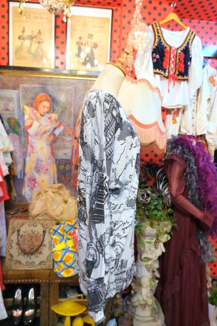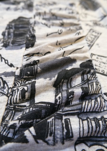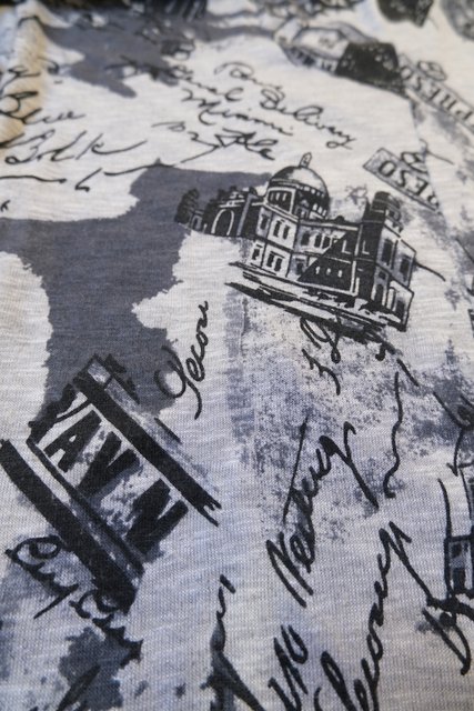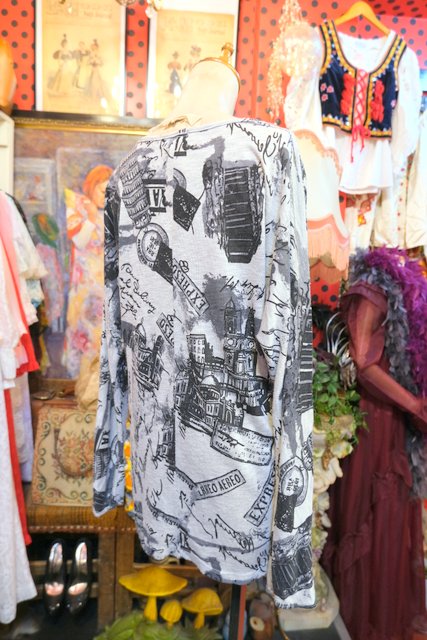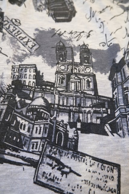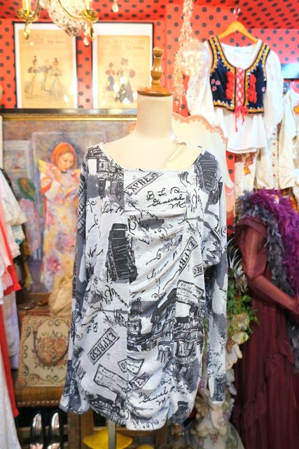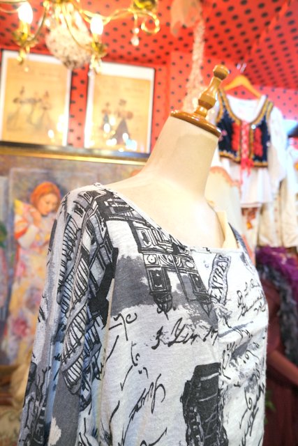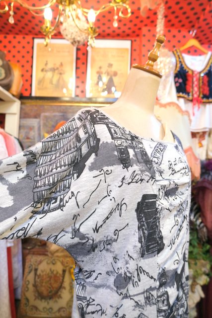 前身頃のギャザーデザインや街並みプリントがお洒落で個性的な1980年代頃のヨーロピアンカットソー