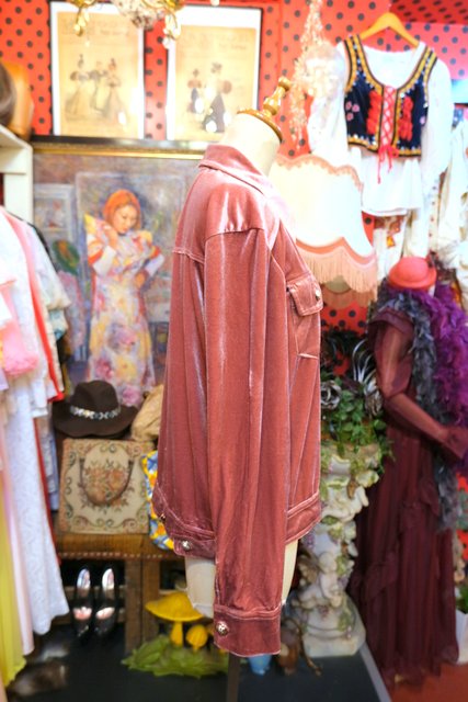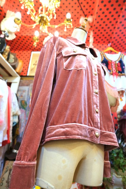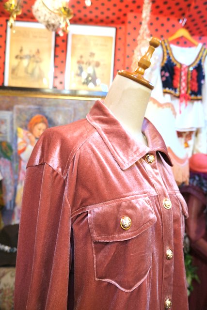 光沢感があるくすんだピンク色に紋章ゴールドボタンがカッコいいヨーロピアンベロアジャケット