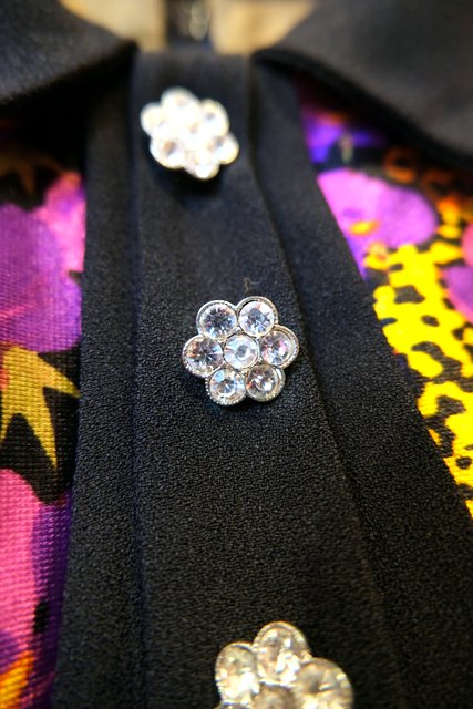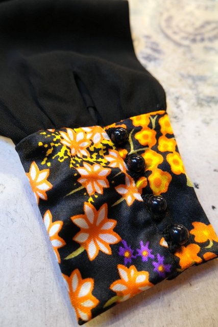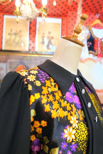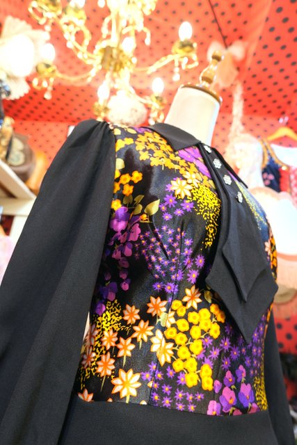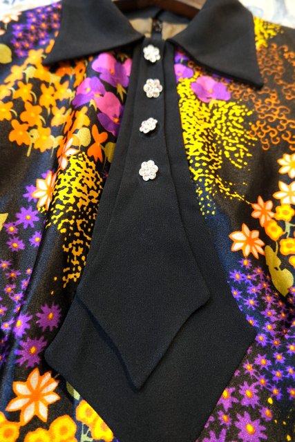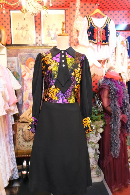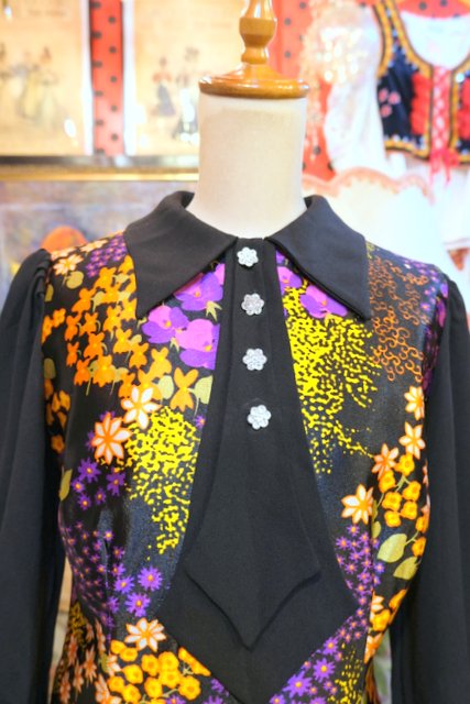 カラフルでレトロな花柄模様にラインストーン付きのネクタイデザインが可愛らしい1960~70年代頃のヨーロピアンヴィンテージワンピース