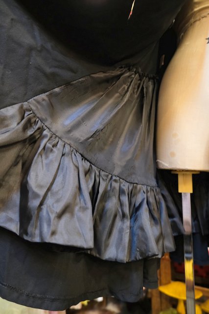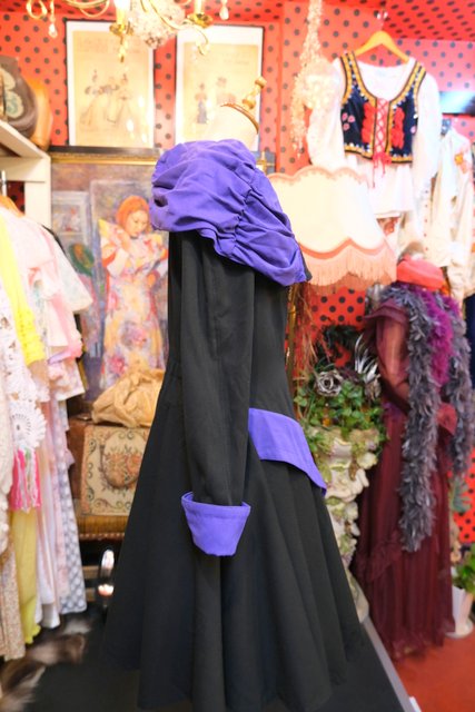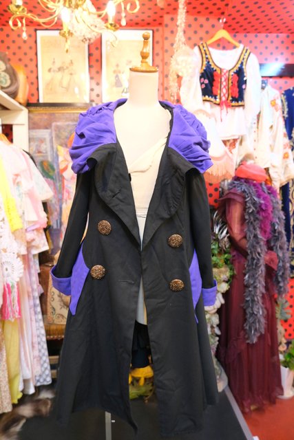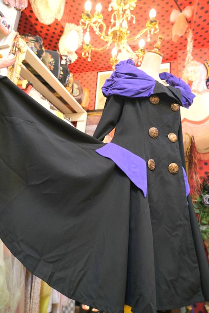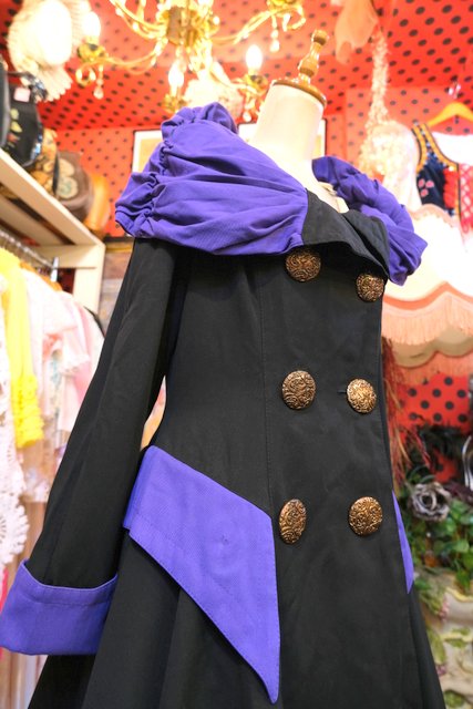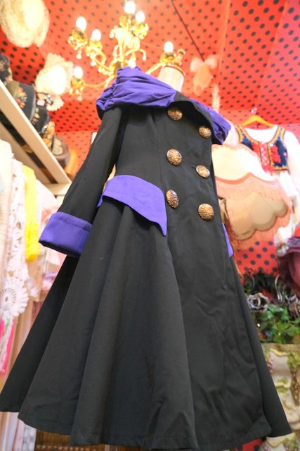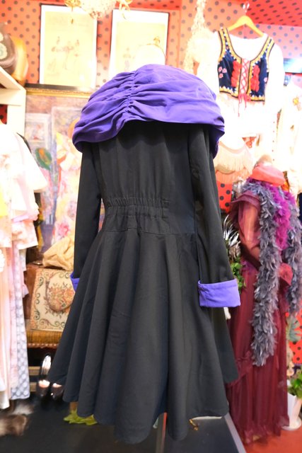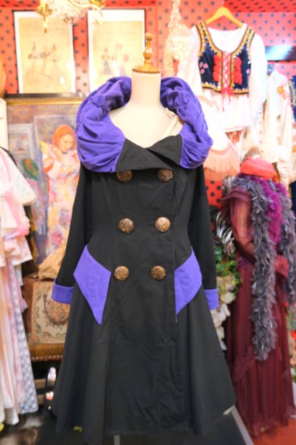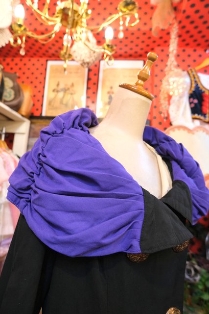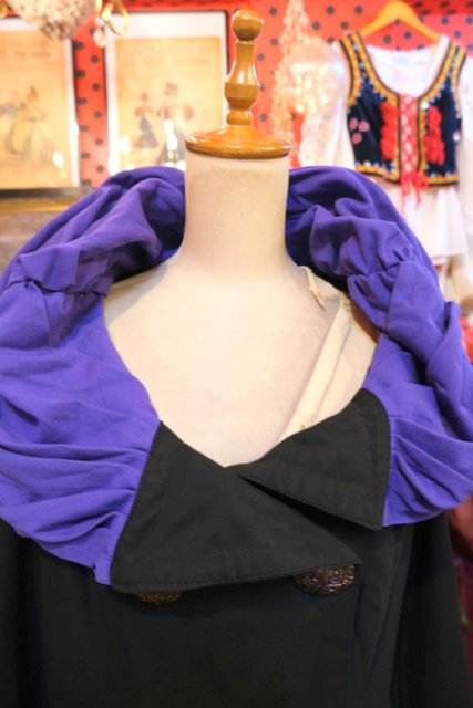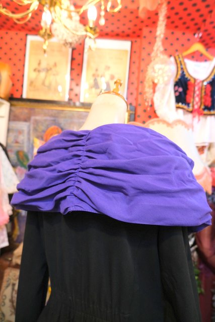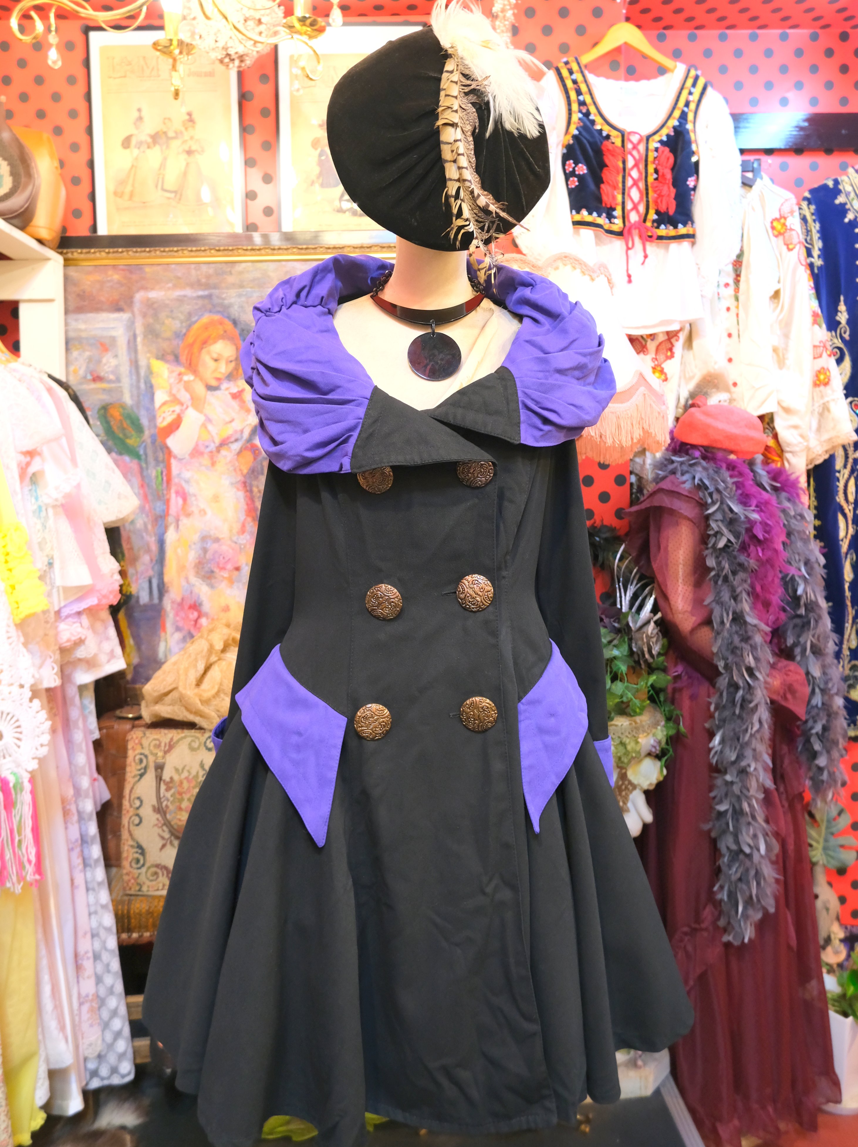 モードな黒×パープル切り替えにドレープ感がある大きな襟やレトロボタン、エレガントなサーキュラーフレアデザインが魅力的な1980年代頃のフランス製ヴィンテージワンピースコート