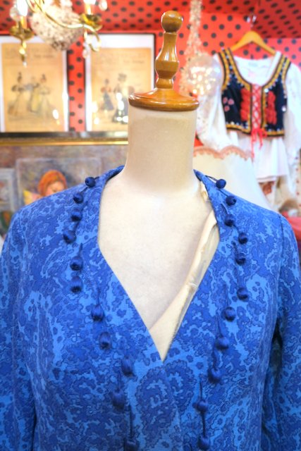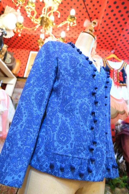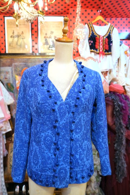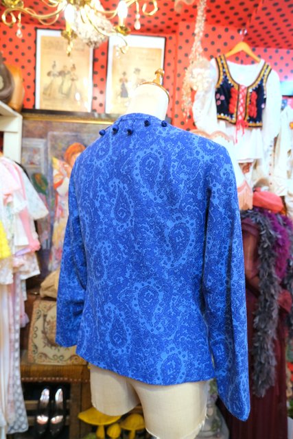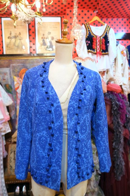 ブルーベースのサイケデリック柄にボンボン付きや首回りがスッキリと綺麗に見えるペンタゴンネックがお洒落な1970年代頃のヨーロピアンヴィンテージジャケット