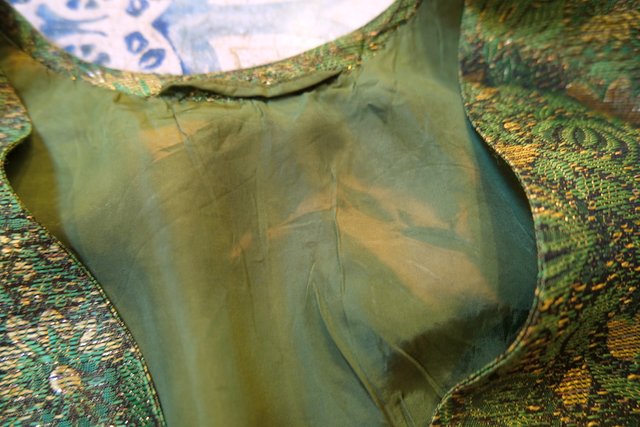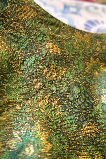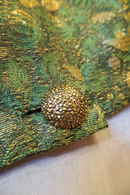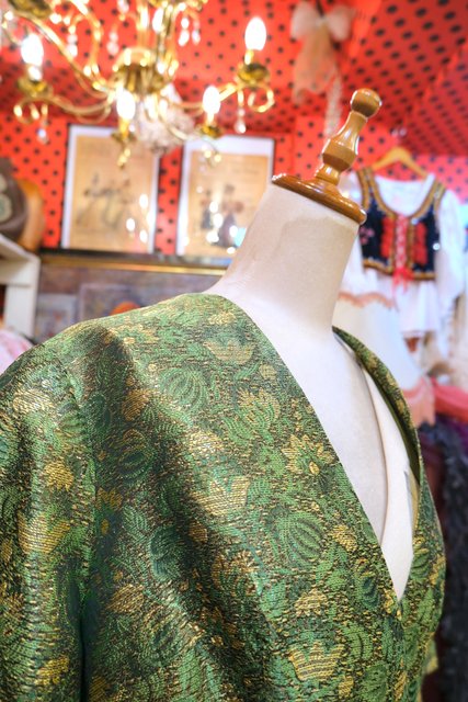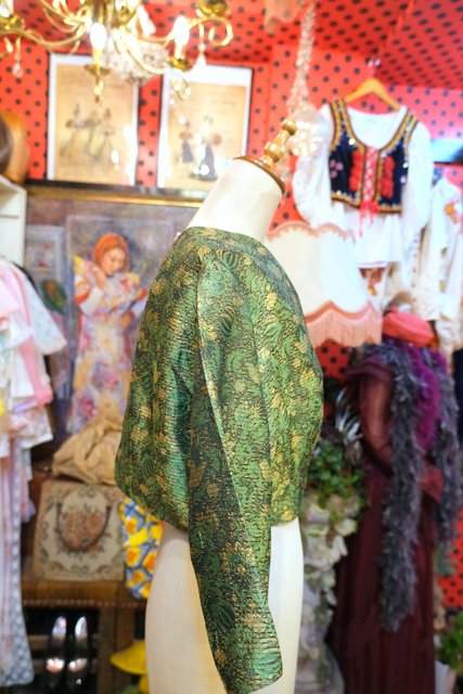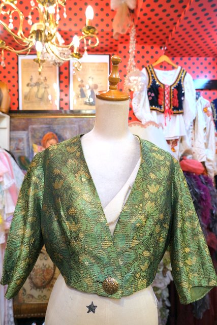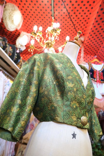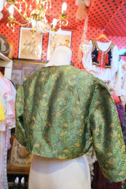 グリーン×ゴールドのボタニカル柄にエレガントなボタンやショート丈が魅力的な1950年代頃のヨーロピアンヴィンテージジャケット