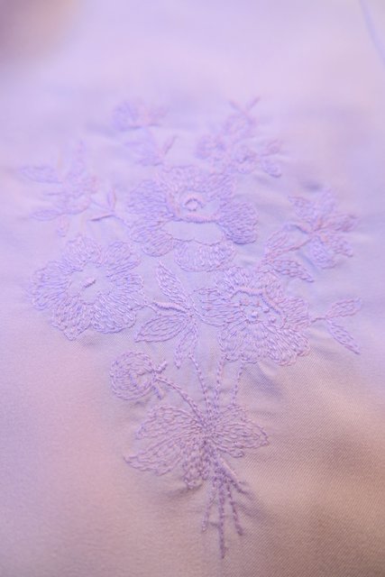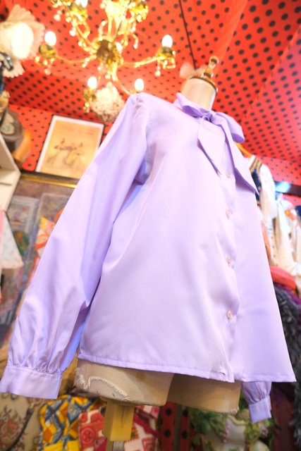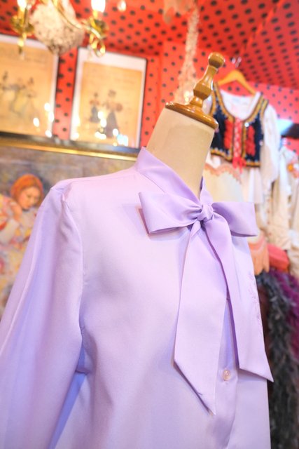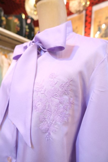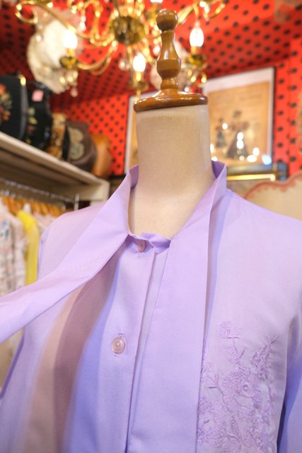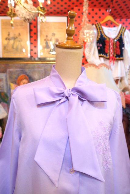 エレガンスな花柄刺繍にリボンボウタイデザインが可愛らしい1970年代頃のヨーロピアンヴィンテージブラウス