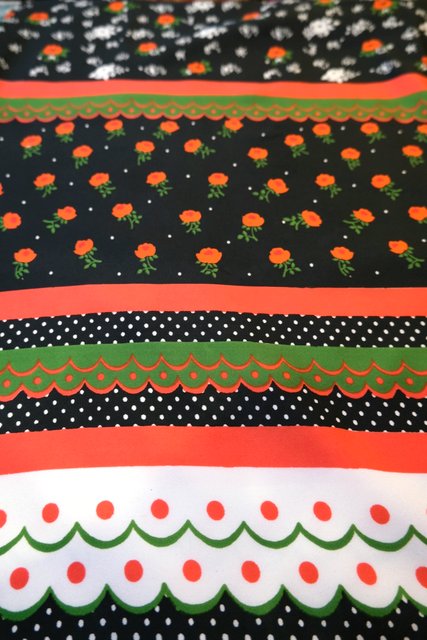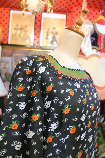 エレガントガーリーな花柄、水玉、チロリアンテープの総柄プリントが可愛らしい1970年代頃のヨーロピアンヴィンテージロングワンピース
