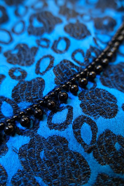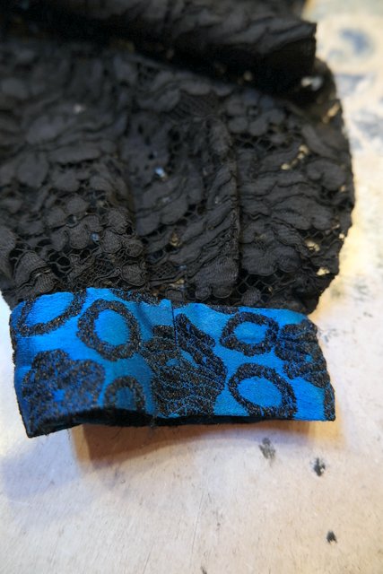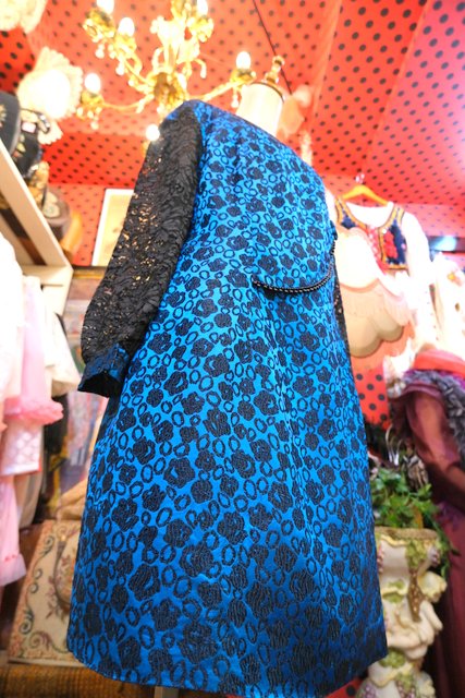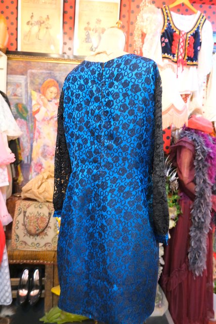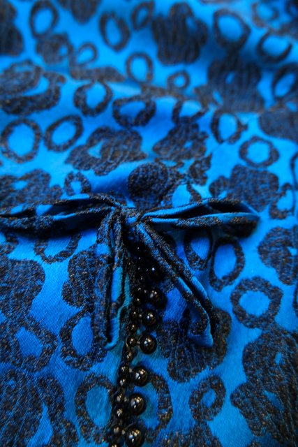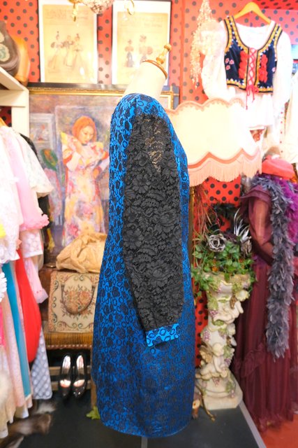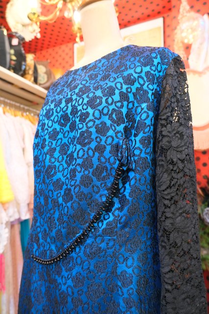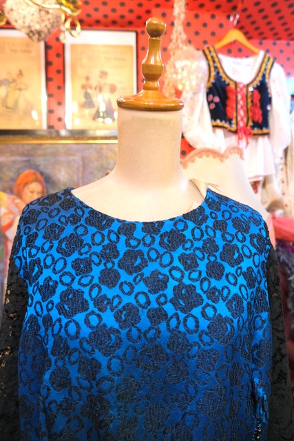 光沢があるブルー×花柄フロッキー加工にリボンビーズデザインや透け感がある花柄レース袖が素敵な1950~60年代頃のヨーロピアンヴィンテージパーティードレス