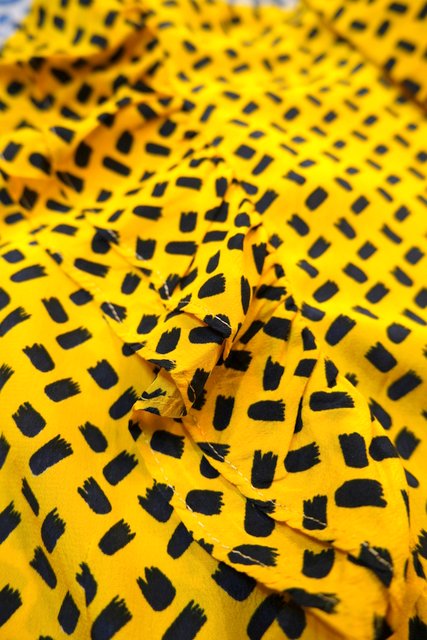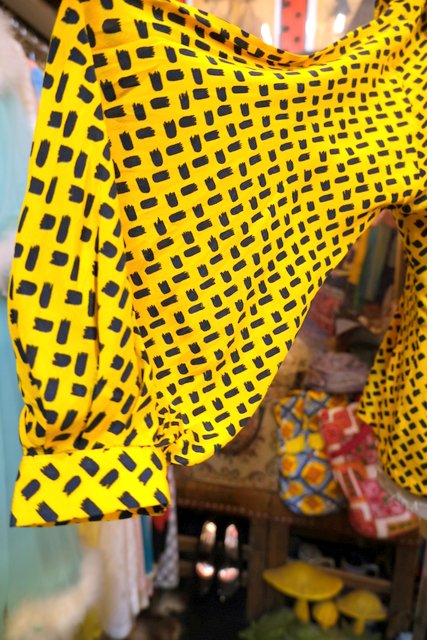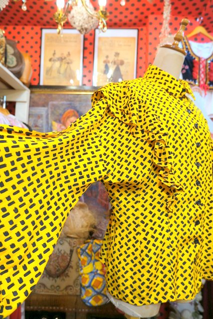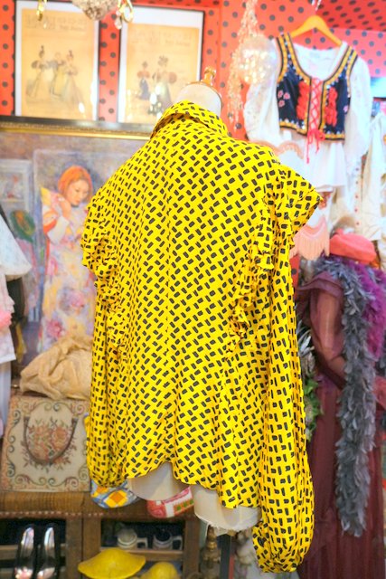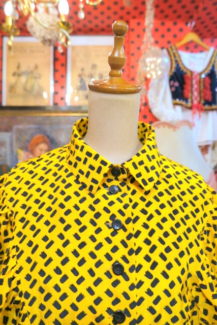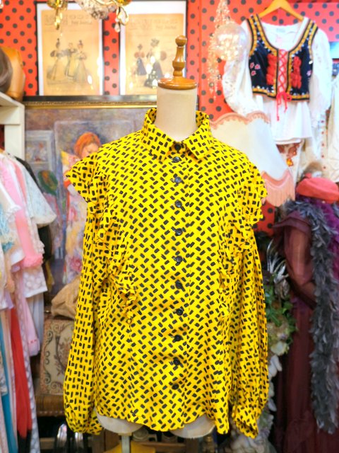 目を惹くイエロー×黒ベースにエレガントなフリルデザインやちょうちん袖が魅力的な1960~70年代頃のヨーロピアンヴィンテージブラウス