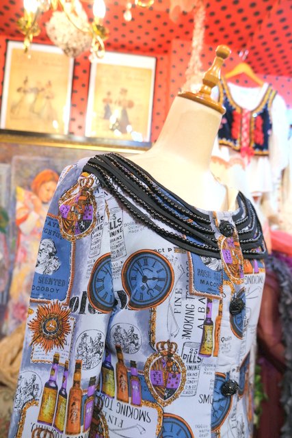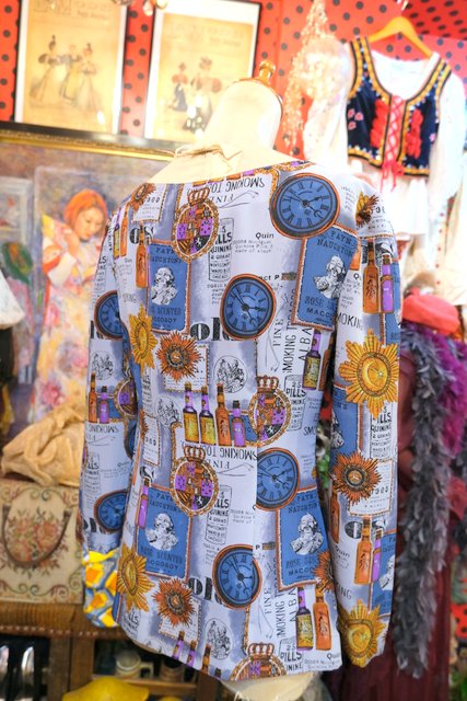 首元のエレガントなビーズ装飾にレトロな総柄プリントやビジューボタンがお洒落な1980年代頃のヨーロピアンヴィンテージシャツジャケット