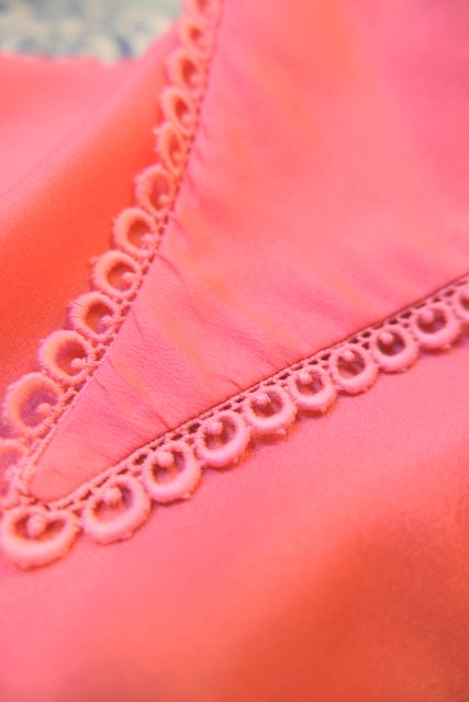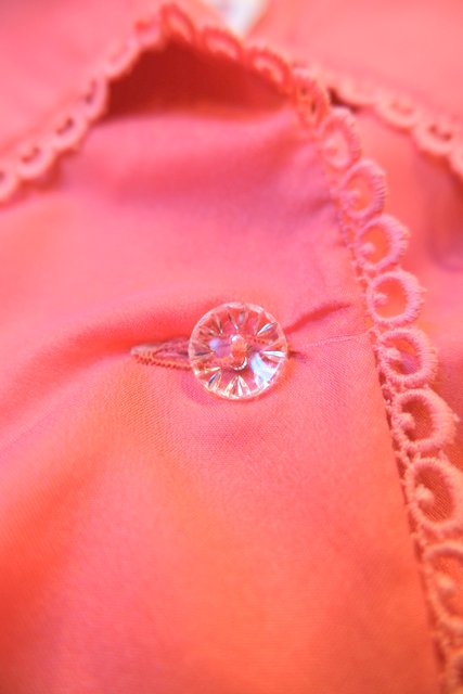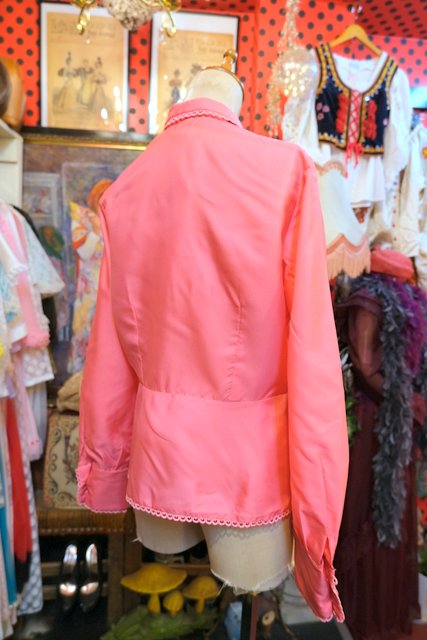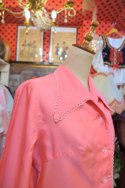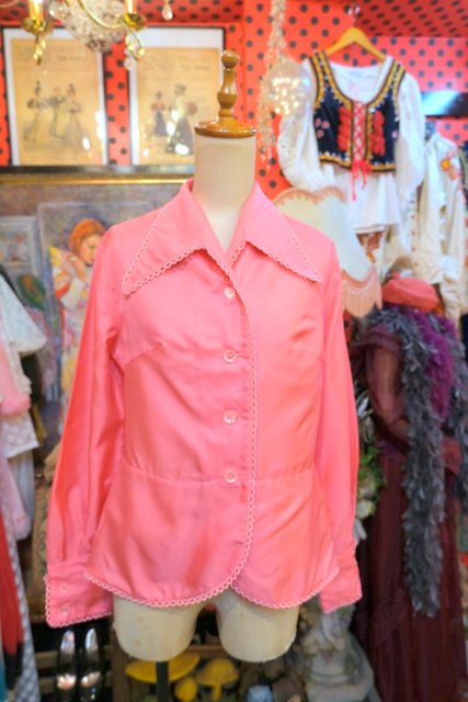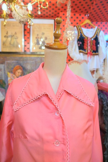 レトロガーリーなレースパイピングデザインにクリアボタンが可愛らしい1970年代頃のヨーロピアンヴィンテージブラウス