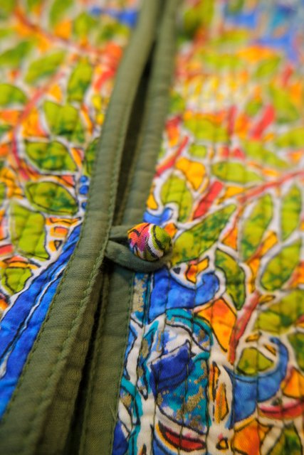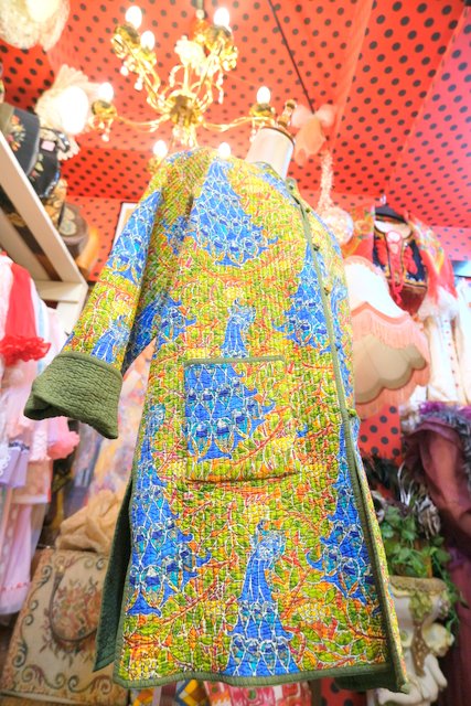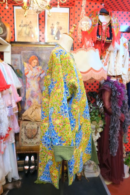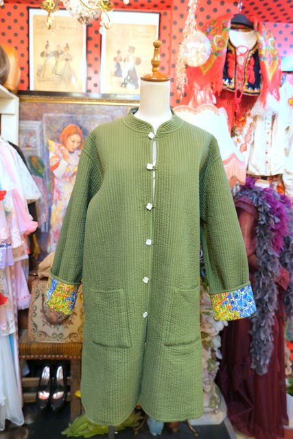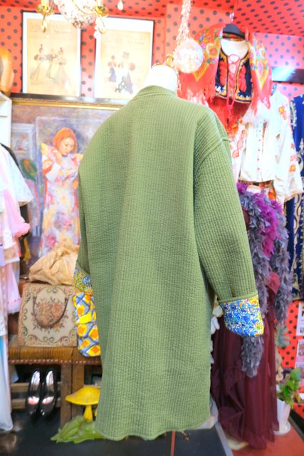 カラフルなボタニカル×孔雀柄とオリーブグリーンのリバーシブルデザインが素敵なヨーロピアンエスニックオーバーサイズコート くるみボタンやシェルボタンがお洒落ポイント!