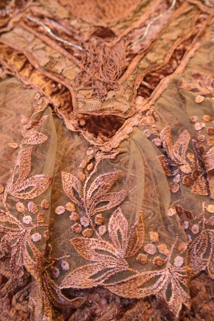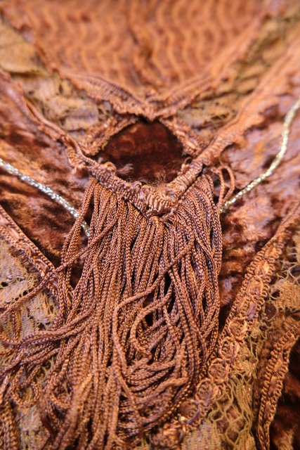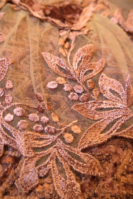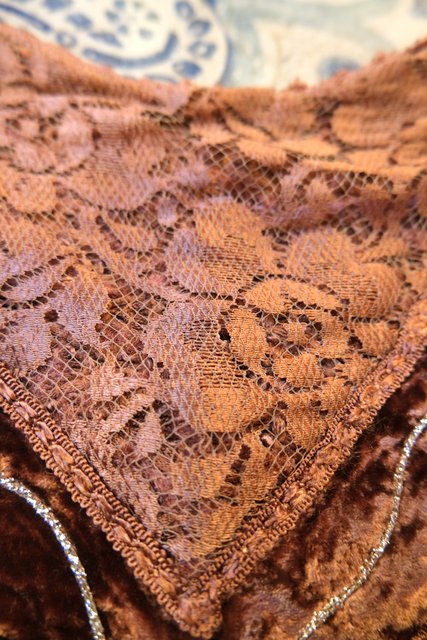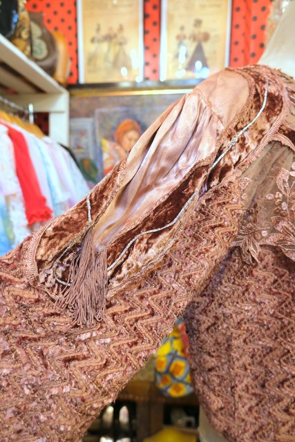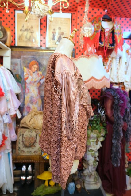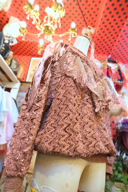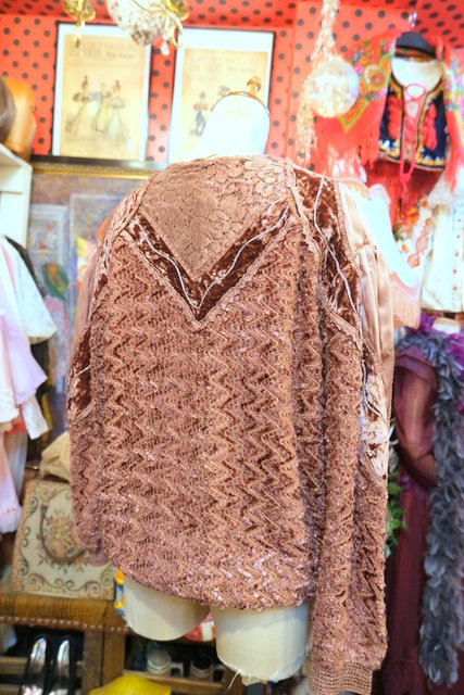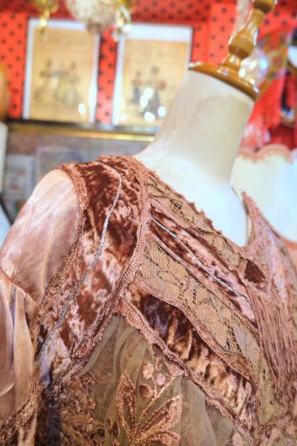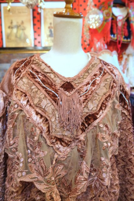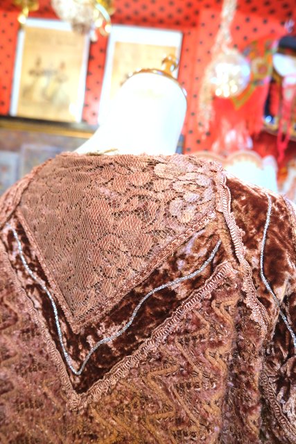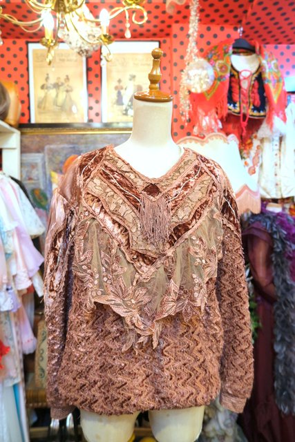 アンティーク感漂う花柄レースやベロア、透け感がある花柄刺繍シフォンなどのパッチワークデザインにフリンジ付きが可愛らしい1980年代頃のイタリア製ヴィンテージトップス