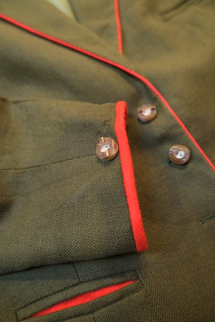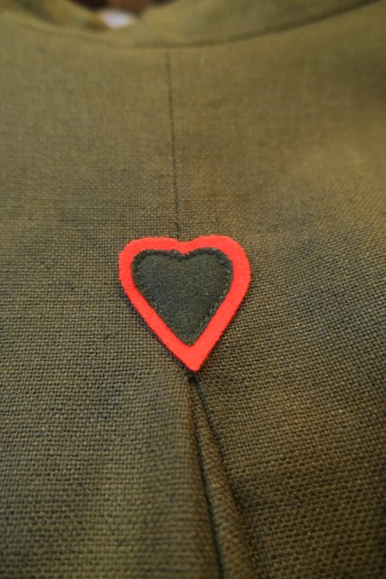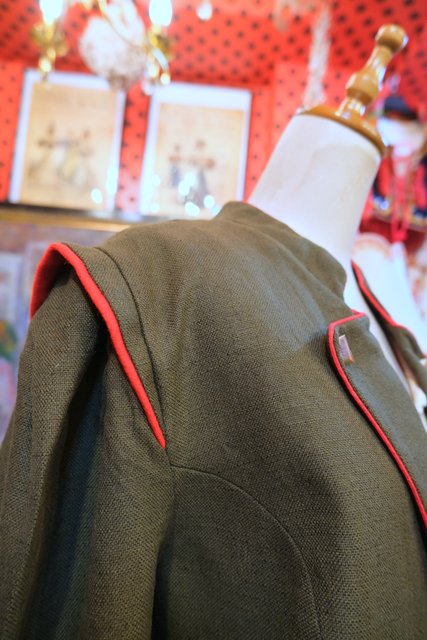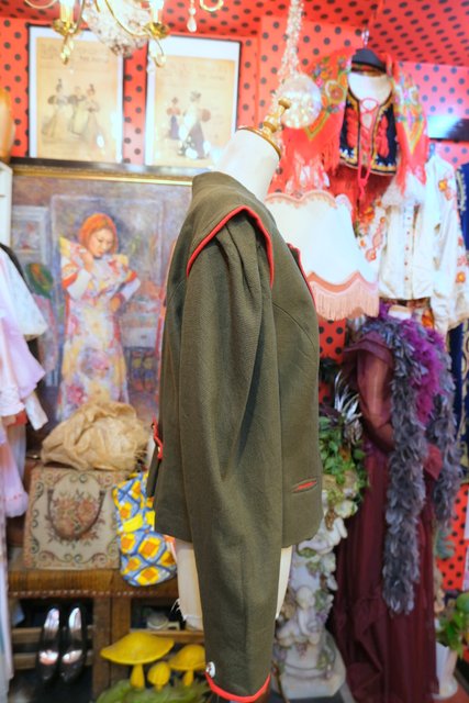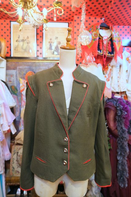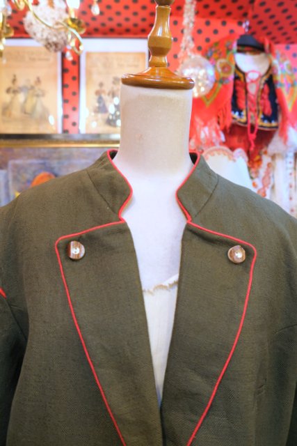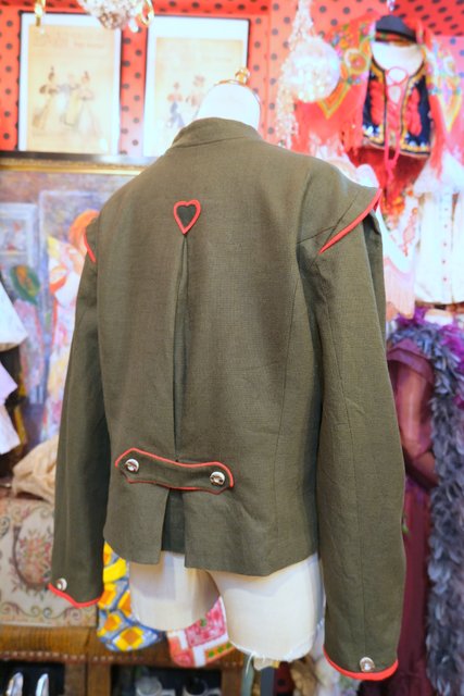 エレガントにもマニッシュな印象にもなるカーキ×赤パイピングデザインにバックのハートアップリケが可愛らしい1970年代頃のヨーロピアンヴィンテージチロルジャケット