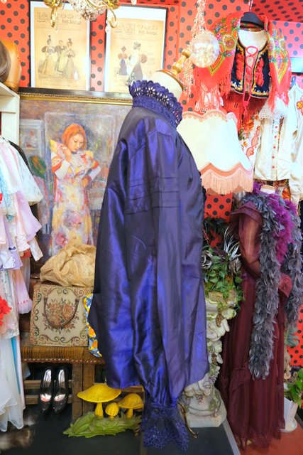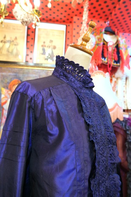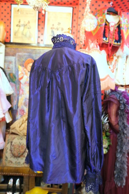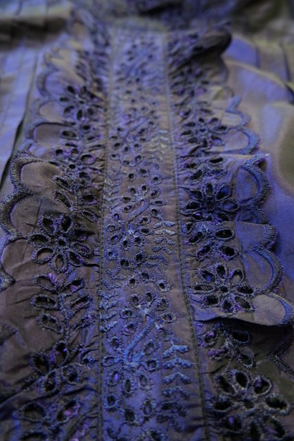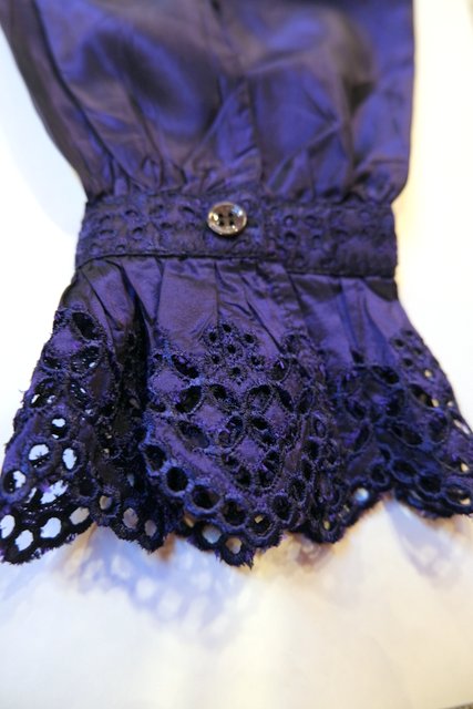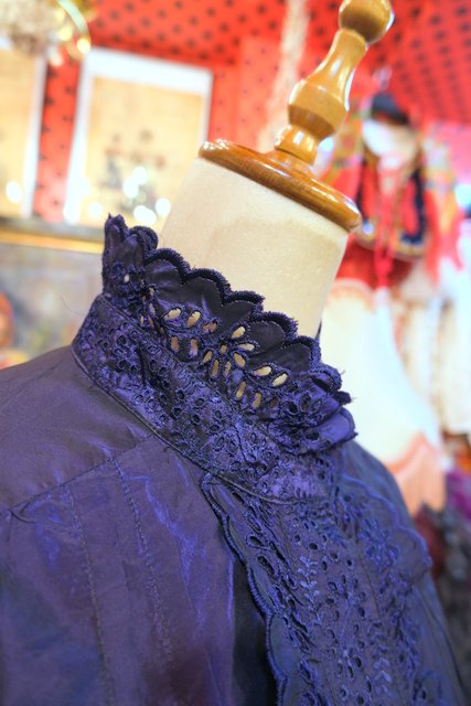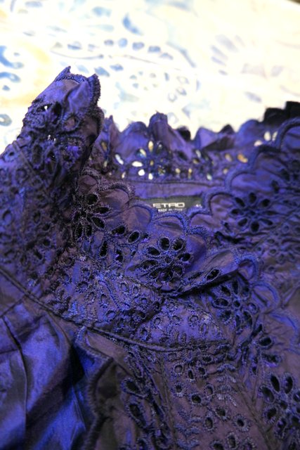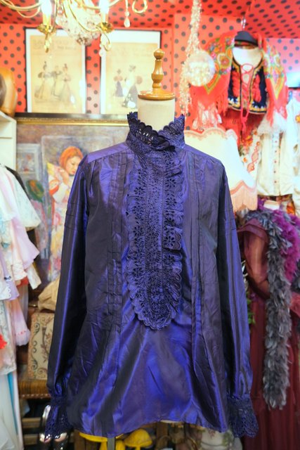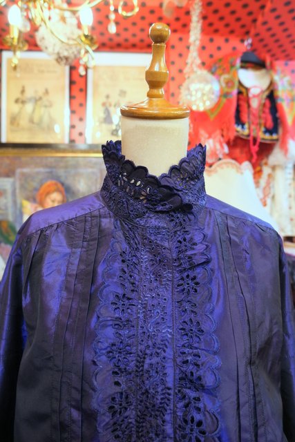 ボリューミーなカットワークレース立ち襟&前立てデザインに光沢感がエレガントなイタリア高級ブランドETROシルクブラウス
