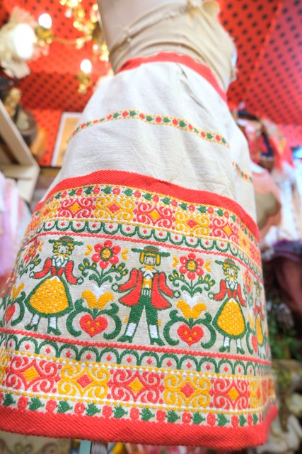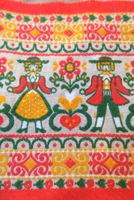 カラフルポップなチロリアンテープやディアンドル衣装のお人形刺繍が可愛らしい1970年代頃のオーストリア製ヴィンテージチロルエプロン