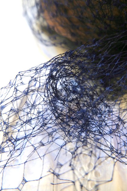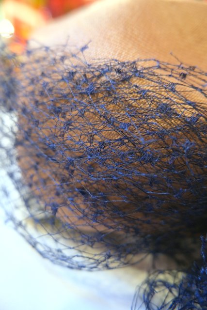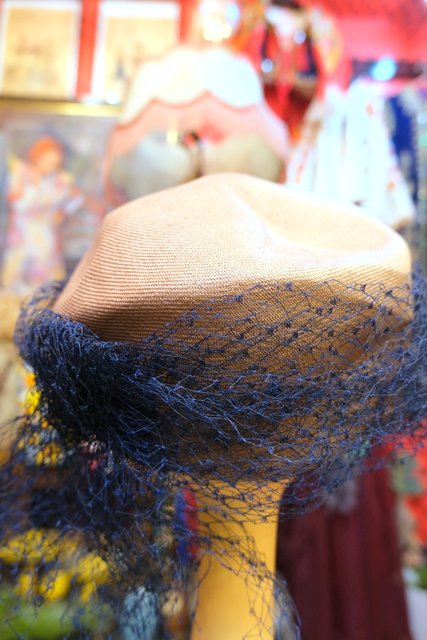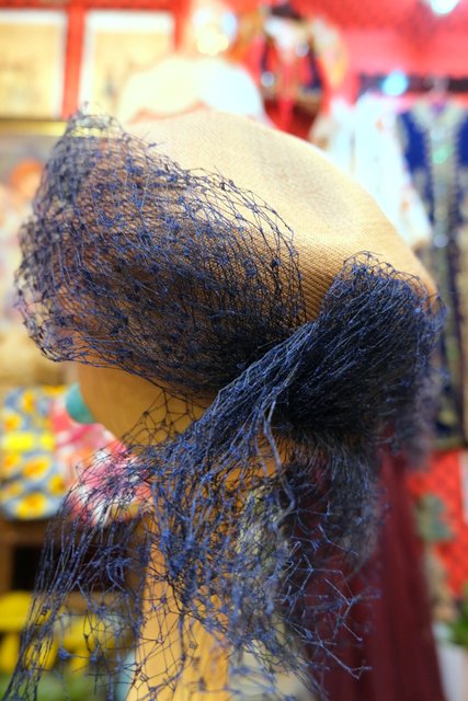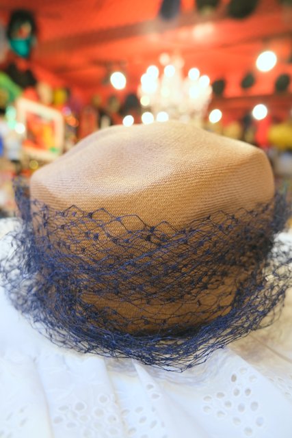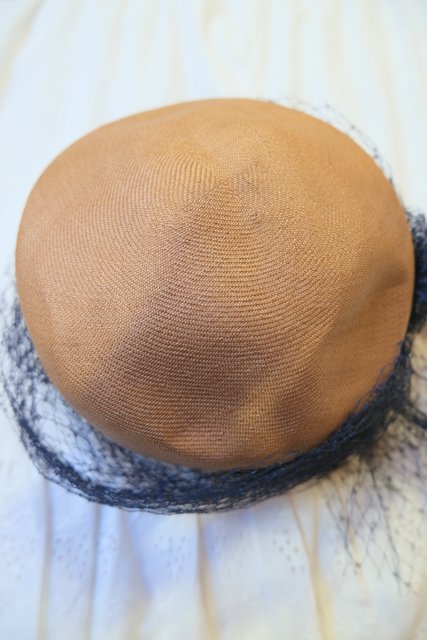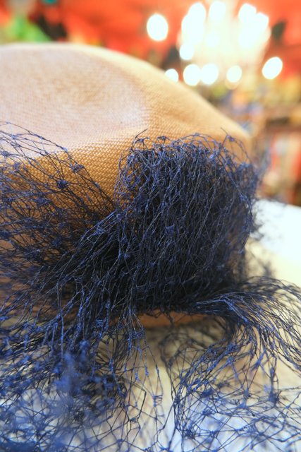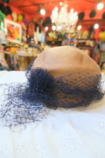 ベージュ茶系ベースに繊細なネイビーチュールデザインが素敵なスペインで見つけた1940~50年代頃のアンティーク帽子