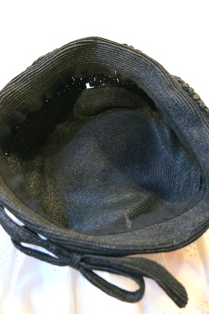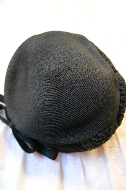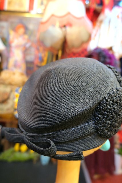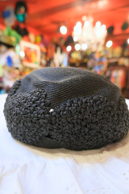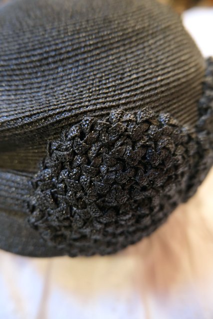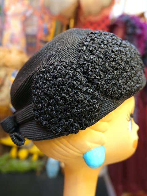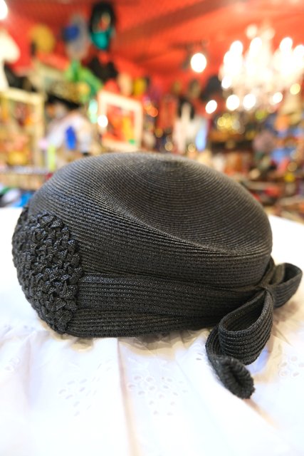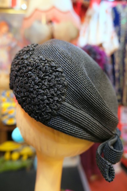 細かく編み込まれたお花のようなデザインに丸みがあるフォルムやバックリボンが素敵なスペインで見つけた1940~50年代頃のアンティーク帽子