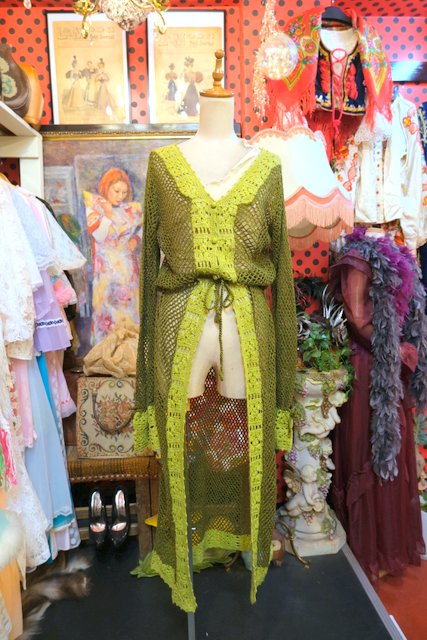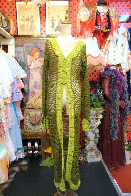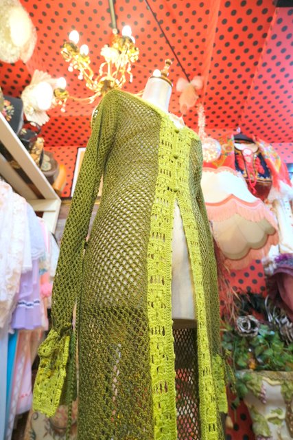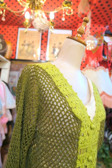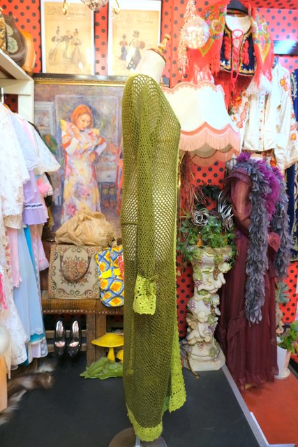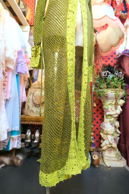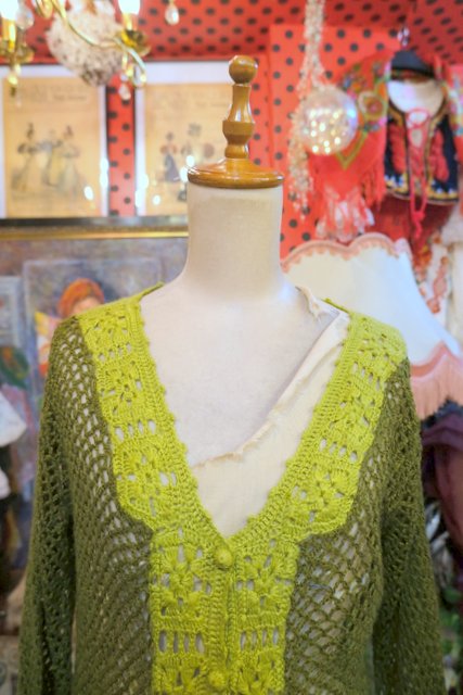 オリーブグリーンメッシュ×くすんだ黄緑色かぎ編みデザインがボヘミアンな雰囲気漂うヨーロピアンロングカーディガン ★SALE★