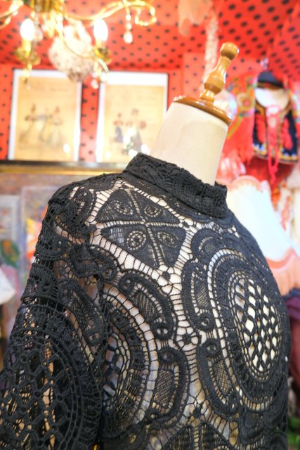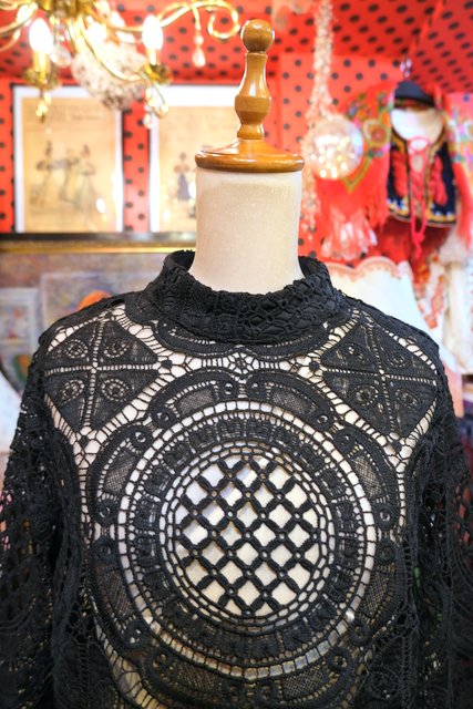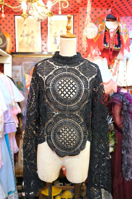 エレガントでサイケデリックなかぎ編みデザインにショート丈×フレア袖が魅力的なヨーロピアンレーストップス