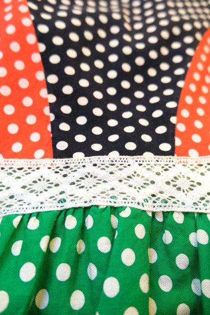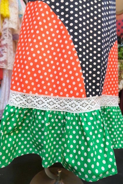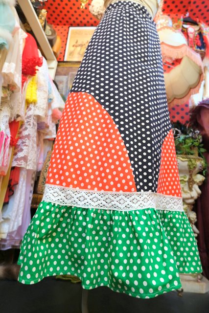 黒×赤×グリーン水玉のパッチワークデザインに花柄レースやフリルが可愛らしい1970年代頃のヨーロピアンヴィンテージロングスカート
