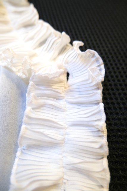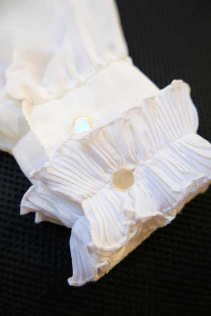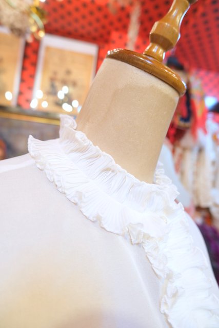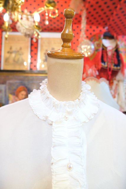 エレガントなアコーディオンプリーツフリル襟や前立て、カフスが素敵な1970年代頃のヨーロピアンヴィンテージブラウス ラインストーン付きのパールボタンがお洒落ポイント!