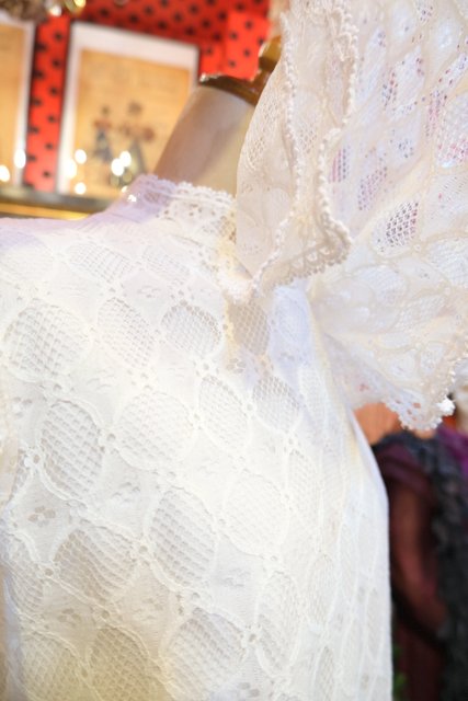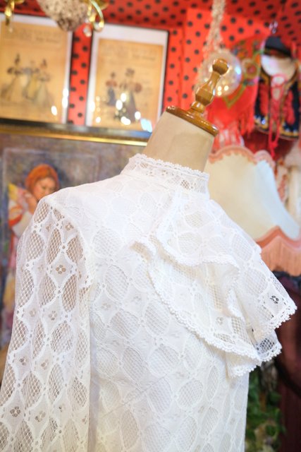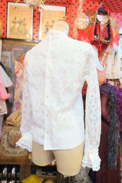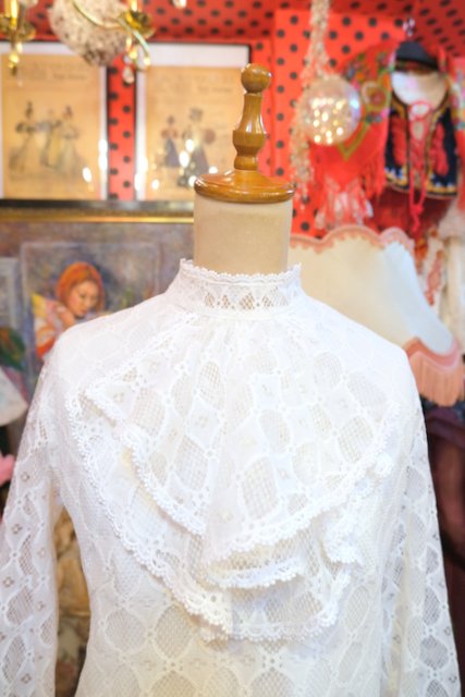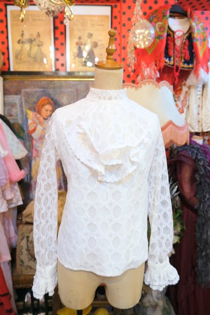 繊細で華やかな花柄総レースデザインにボリューミーなジャボカラーやフリルカフスが魅力的な1970年代頃のヨーロピアンヴィンテージブラウス