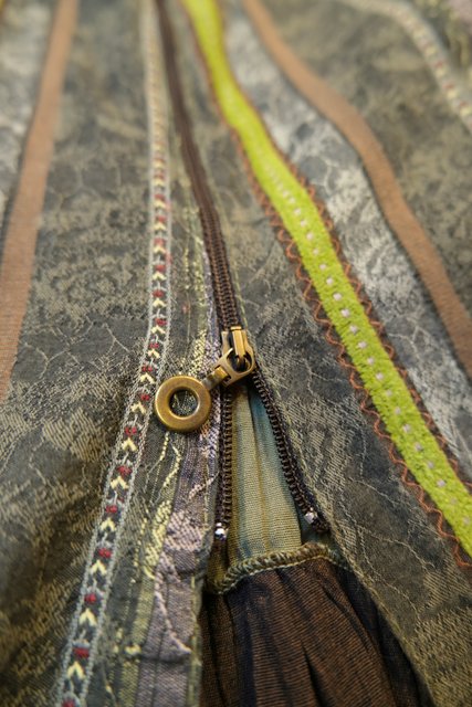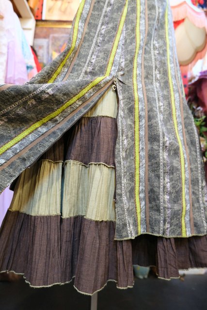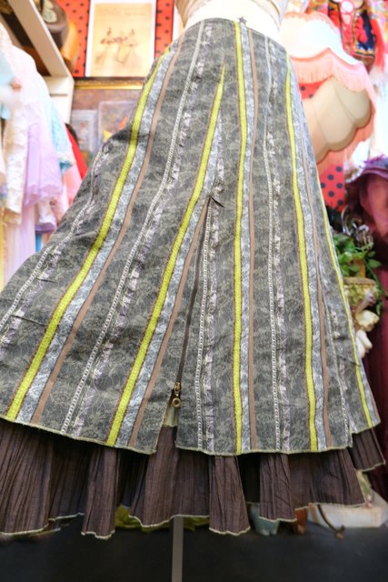 アンティーク感漂う花柄プリントに黄緑色のテープやインナーのティアードスカートがチラリと見えるファスナーデザインがお洒落な1980年代頃のフランス製ヴィンテージスカート