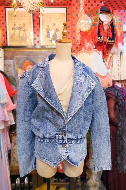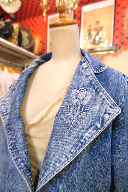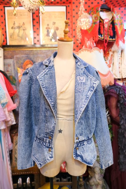 個性的なケミカルウォッシュにお花刺繍入りの襟やボリュームパフスリーブが魅力的な1980年代頃のヨーロピアンヴィンテージデニムジャケット