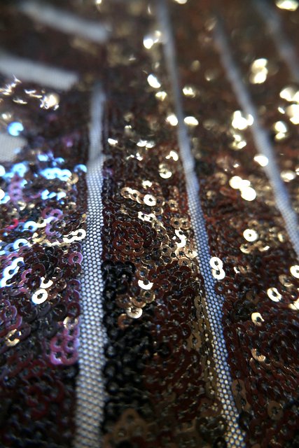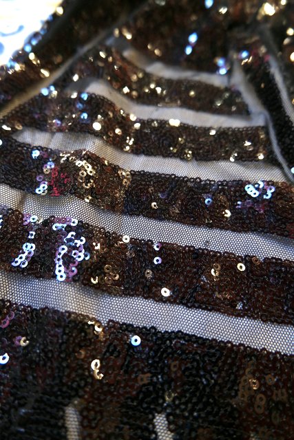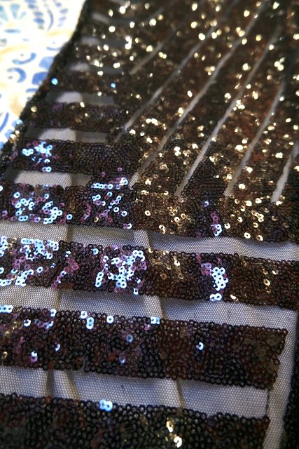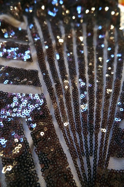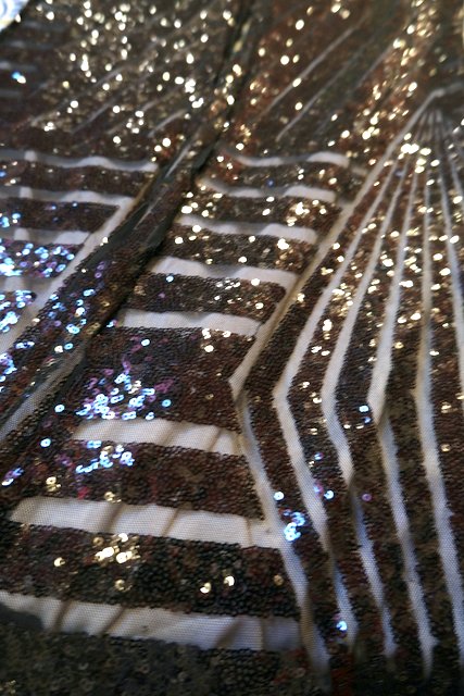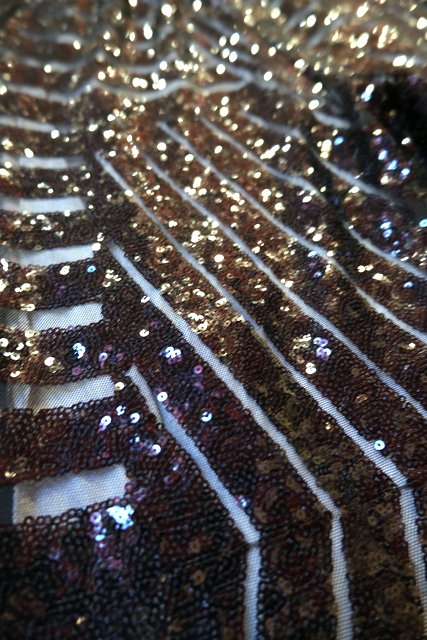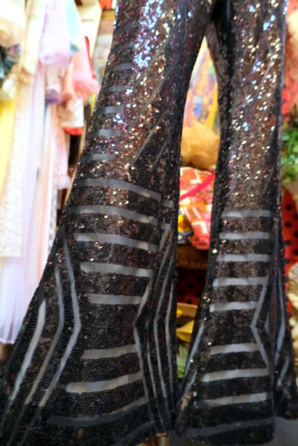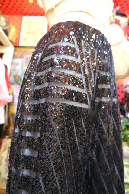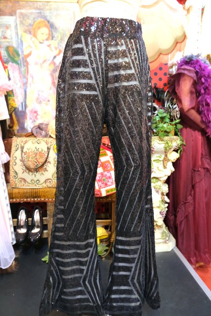 透け感があるシフォン×黒スパンコールのジオメトリック柄が目を惹くヨーロピアンパーティーメタリックパンツ