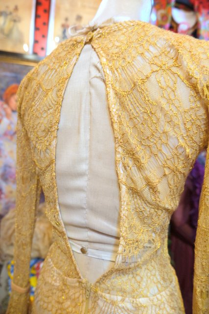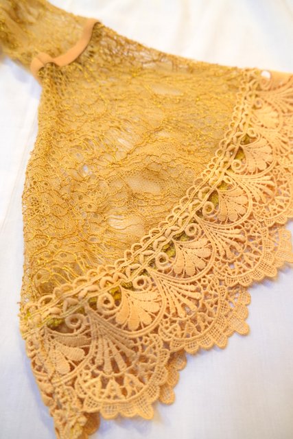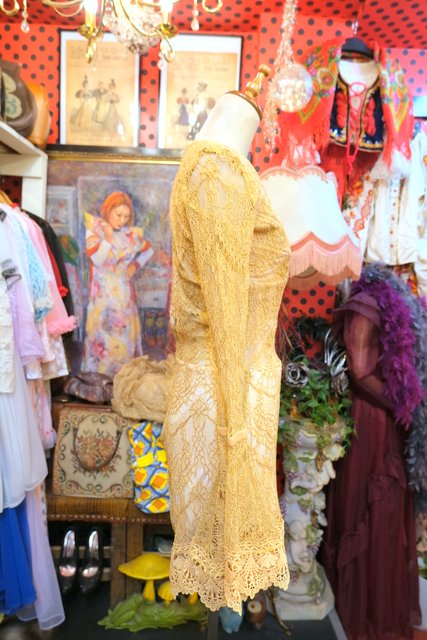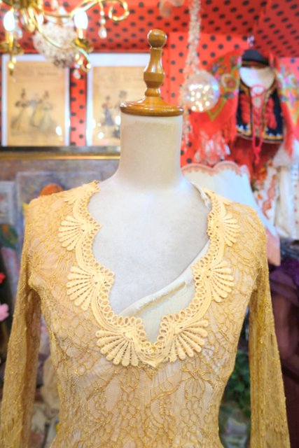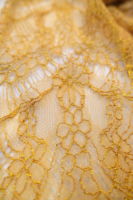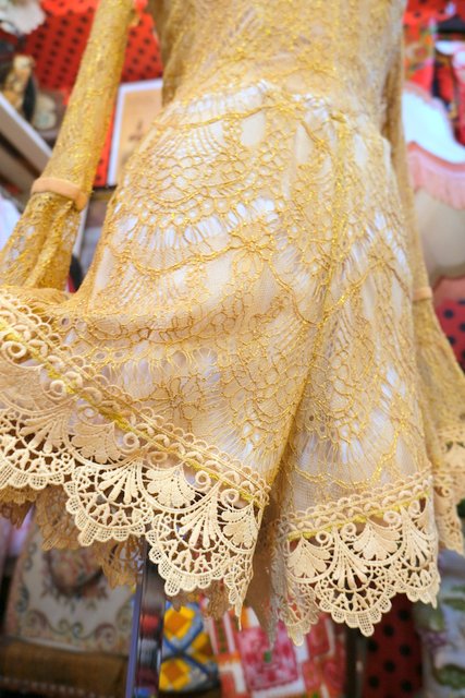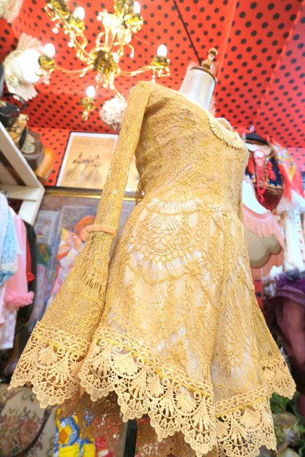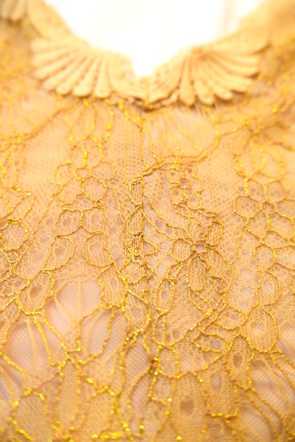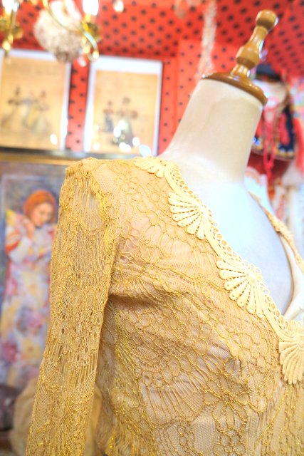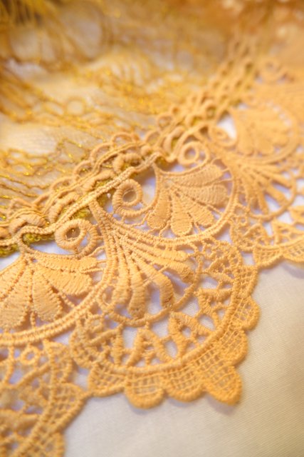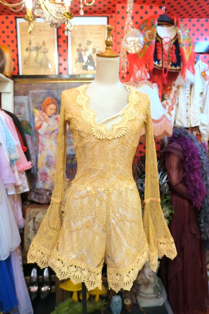 ゴールド×アンバーベージュ系のエレガントな花柄総レースにフレアカフスやショートパンツデザインが可愛らしいヨーロピアンレースサロペット