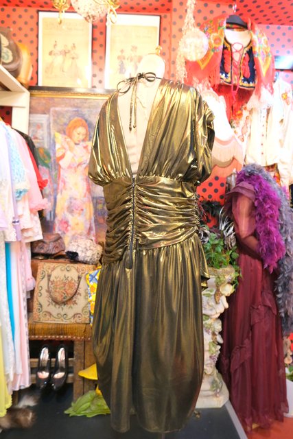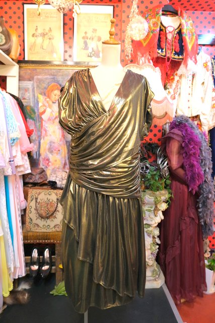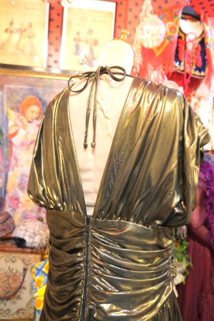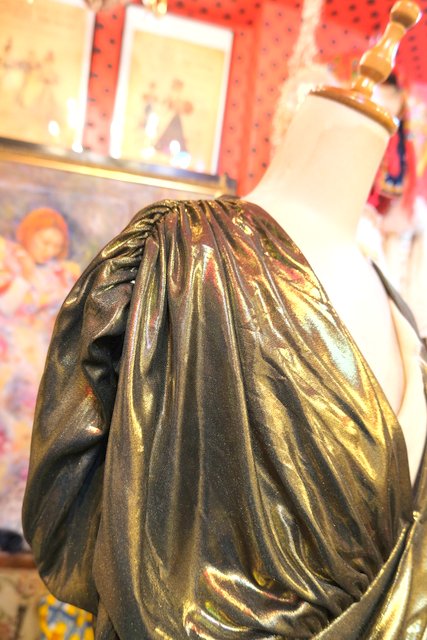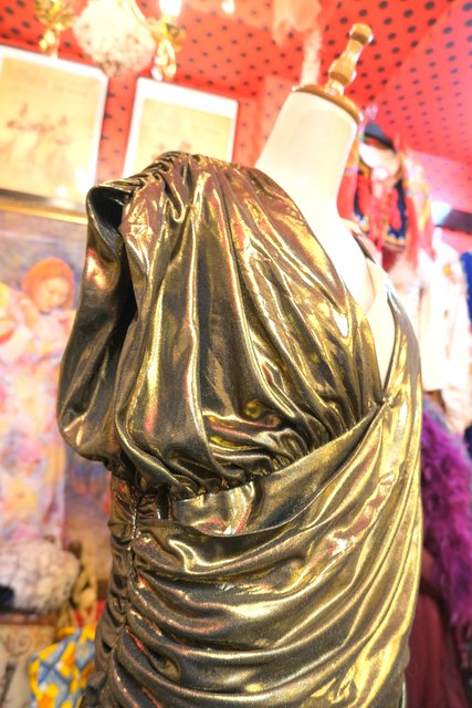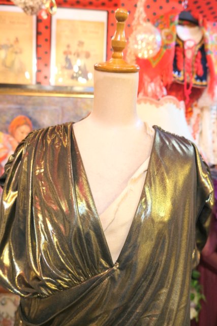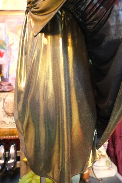 エレガントなゴールドベースに全体のアシンメトリーなドレープデザインが魅力的な1970~80年代頃のヨーロピアンヴィンテージパーティードレス