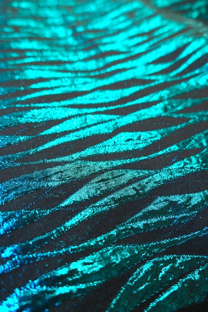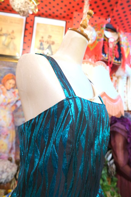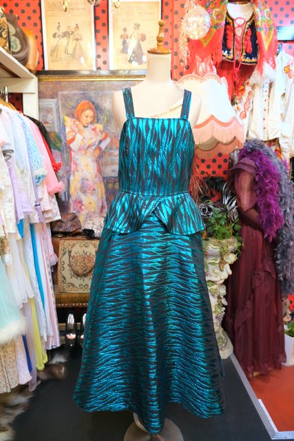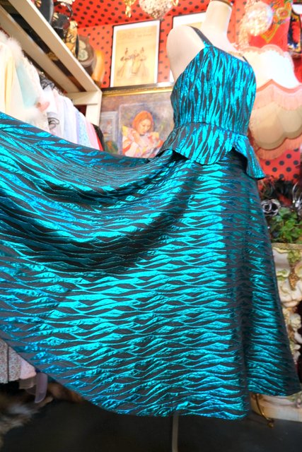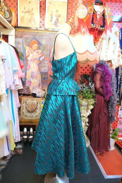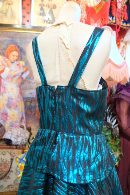 黒×ブルーグリーンのアニマル柄のようなメタリック生地にペプラムやフレアスカートが素敵な1980年代頃のヨーロピアンヴィンテージパーティードレス
