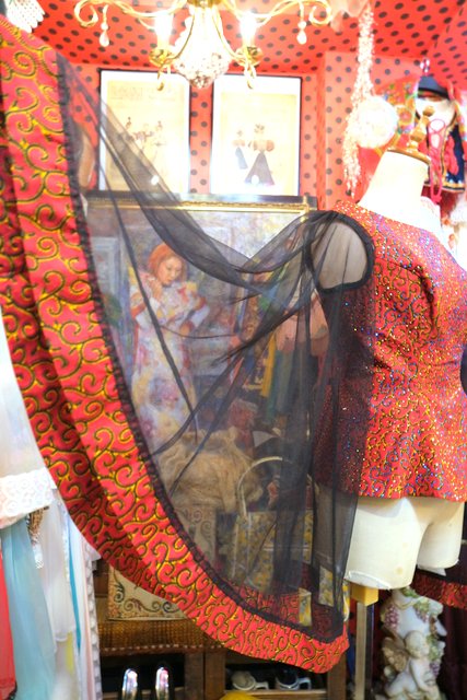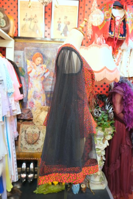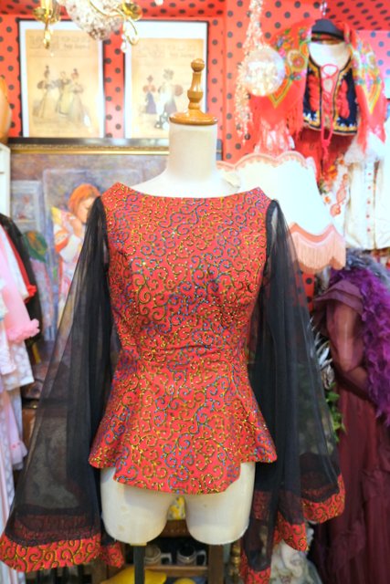 カラフルビジュー付きのエスニック柄に透け感があるボリューミーなシフォンフレア袖が魅力的なヨーロピアンヴィンテージパーティートップス