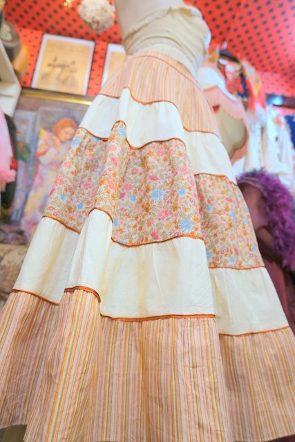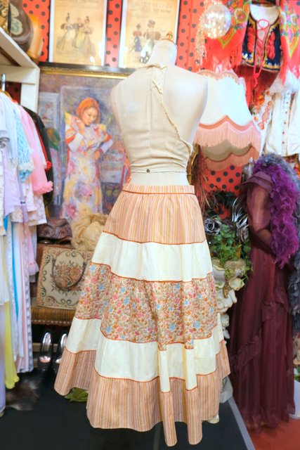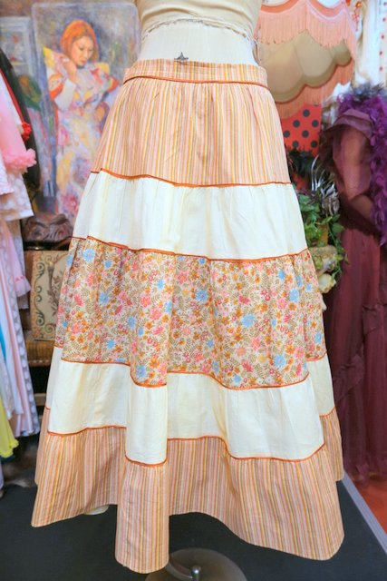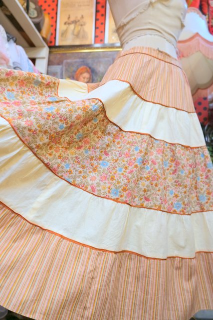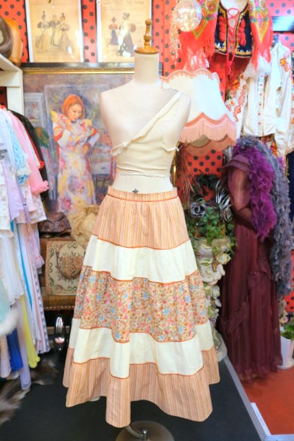 ピンクベージュのストライプ×カントリーな花柄プリントのティアードデザインが可愛らしい1980年代頃のヨーロピアンヴィンテージスカート