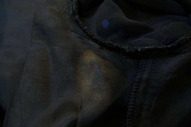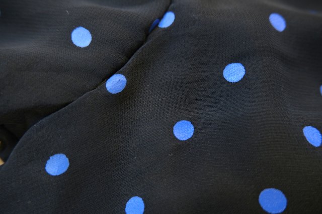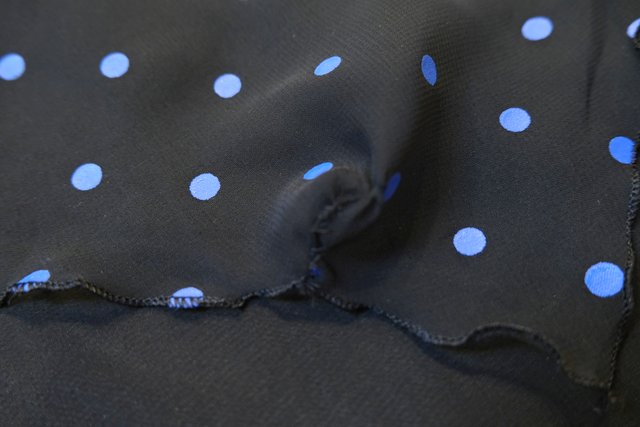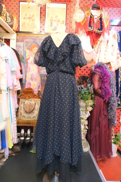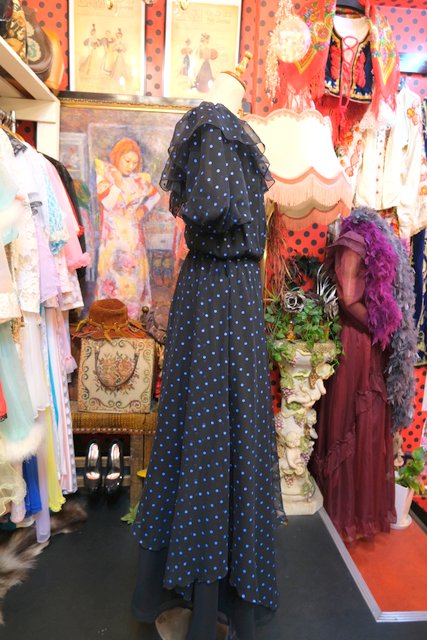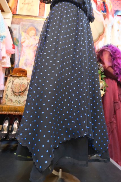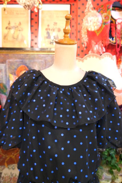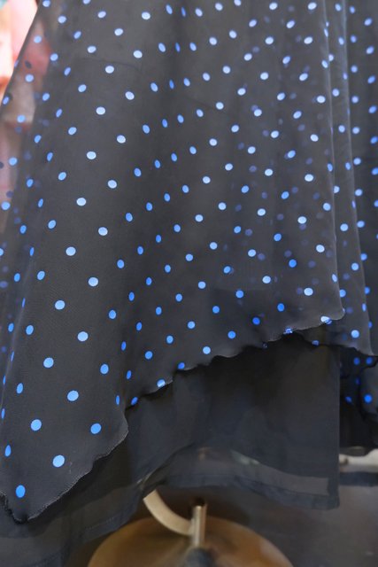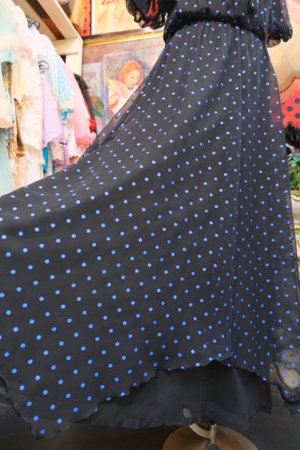 甘すぎない黒×青ドットシフォンにフリルや裾の2枚重ねシフォンデザインがお洒落な1970~80年代頃のヨーロピアンヴィンテージパーティードレス