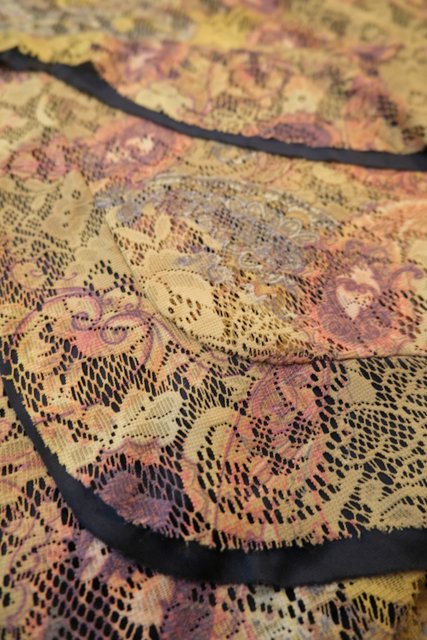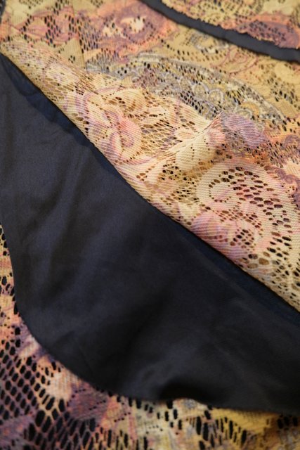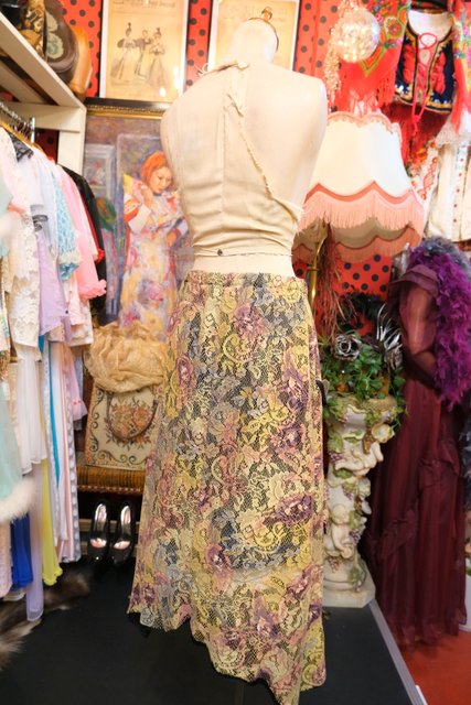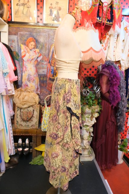 エレガントな花柄総レースにカーキ茶系のペイズリープリントやランダムな裾がお洒落なヨーロピアンレーススカート