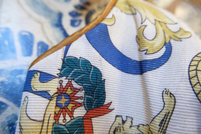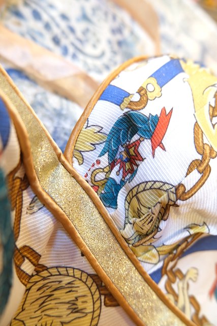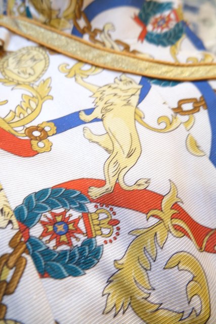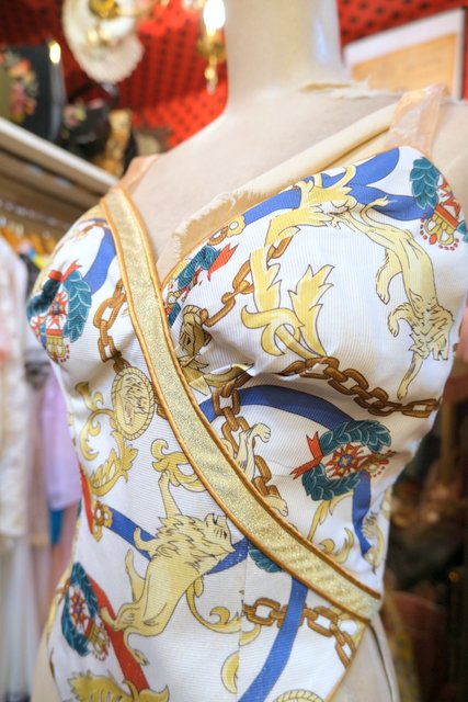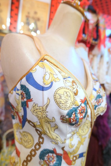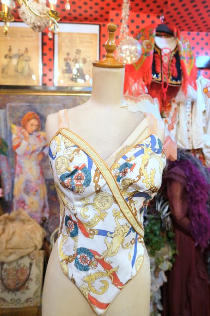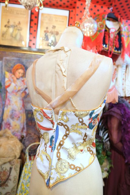ライオンやチェーンなどのエレガントゴージャスな総柄に左胸のプリーツデザインやゴールドラインが素敵な1980~90年代頃のUSA製ヴィンテージコルセット