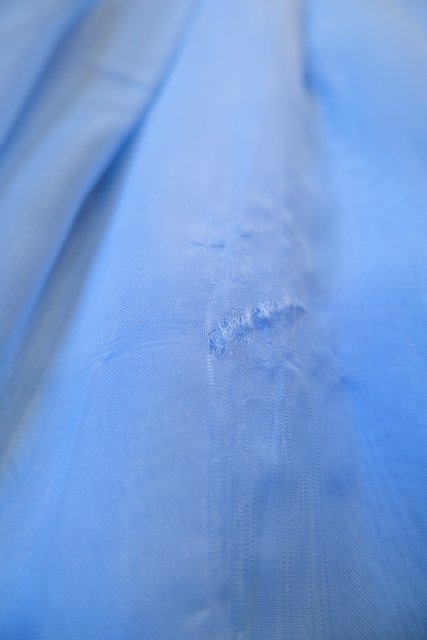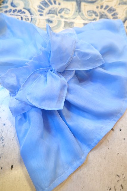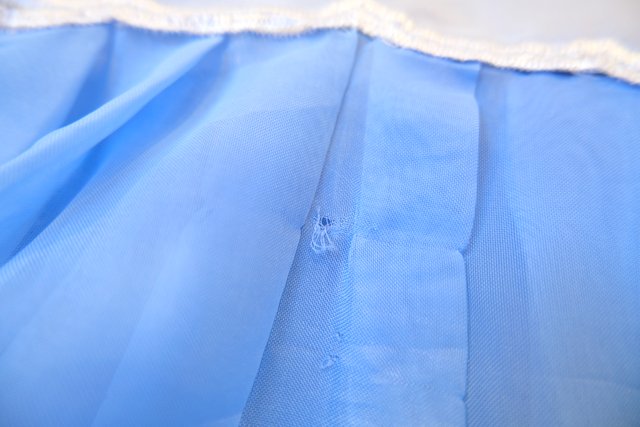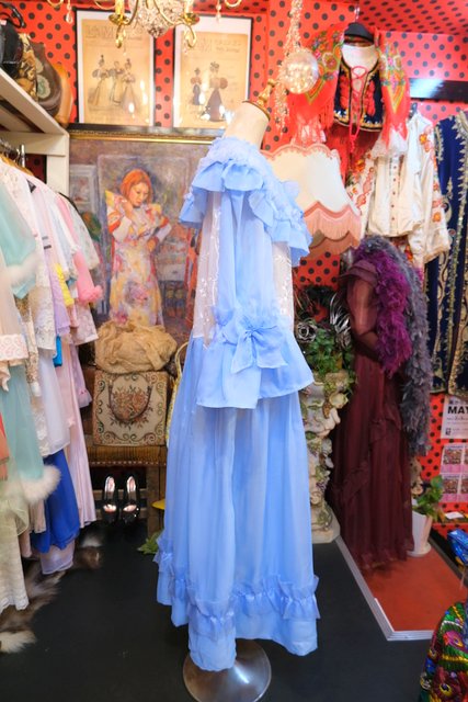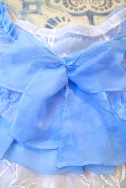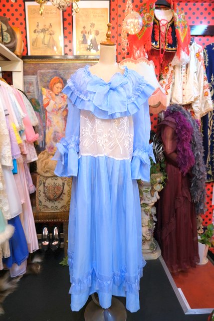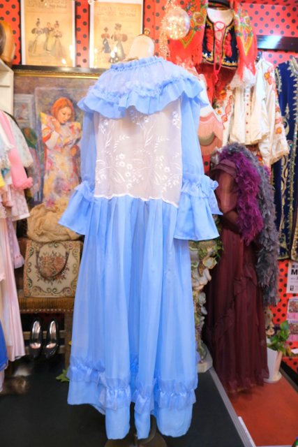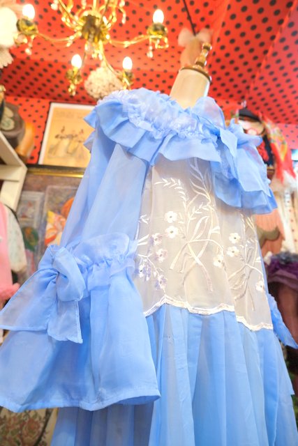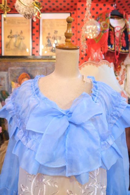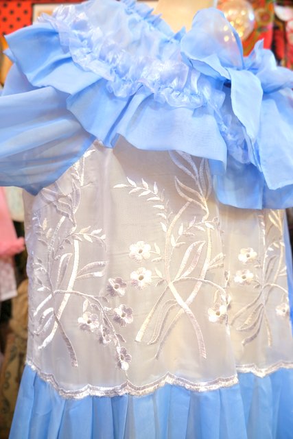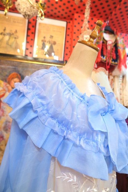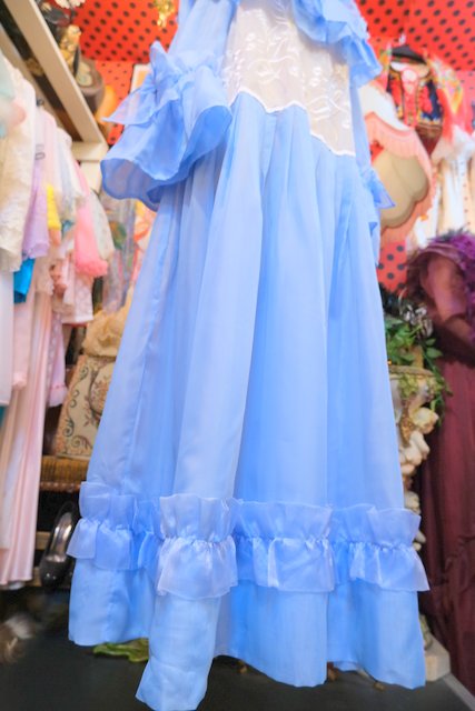透け感がある水色フリルやリボンデザイン×エレガントな花柄刺繍が可愛らしいヨーロピアンオーバーサイズメルヘンワンピース フランスリヨンで見つけた70s生地のハンドメイドドレス