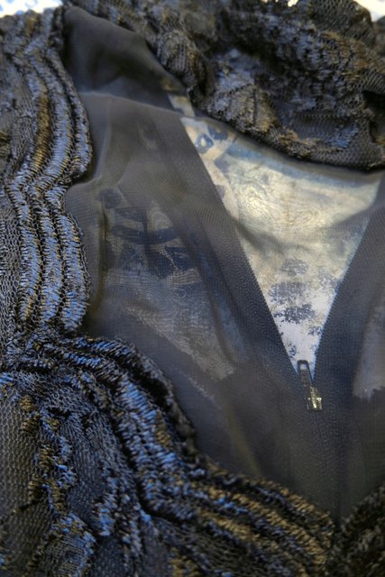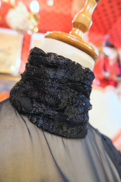 クシュクシュとしたドレープ感のあるネックに胸元のセクシーな透け感やレースデザインが魅力的なヨーロピアンパーティーロングドレス
