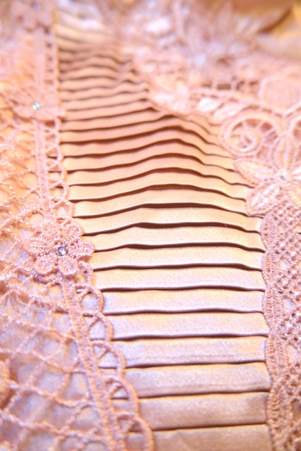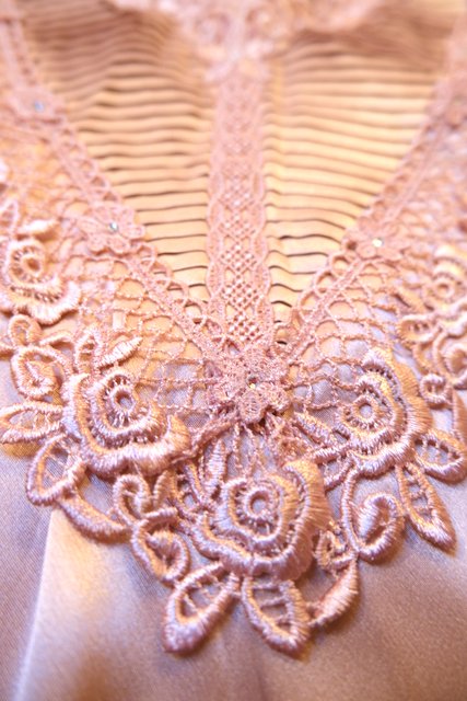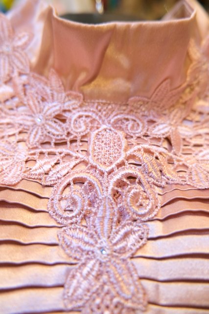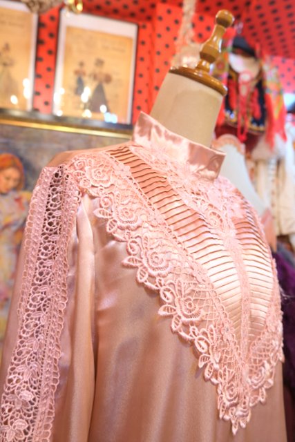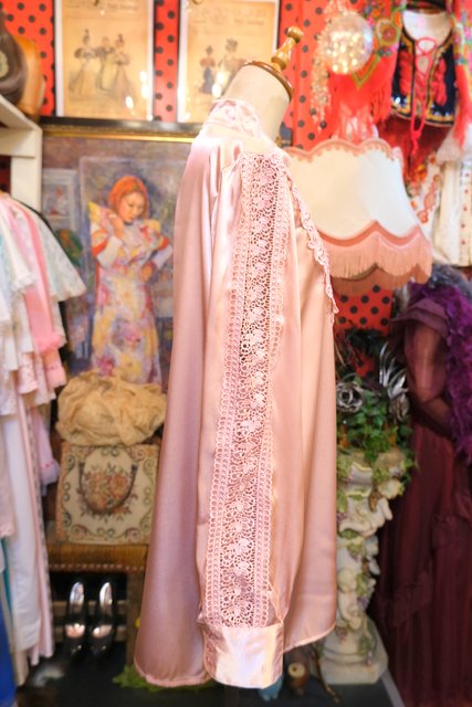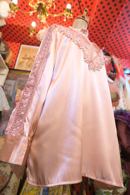 光沢感がある生地に知的な印象のスタンドカラー×華やかなレースデザイン、アームレースの透け感が素敵なヨーロピアンエレガントブラウス