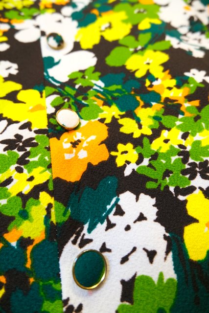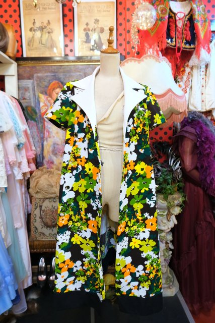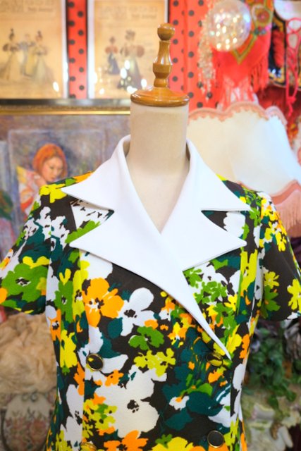 華やかな花柄プリントに先の尖った襟やくるみボタンがお洒落な1960~70年代頃のヨーロピアンヴィンテージワンピース