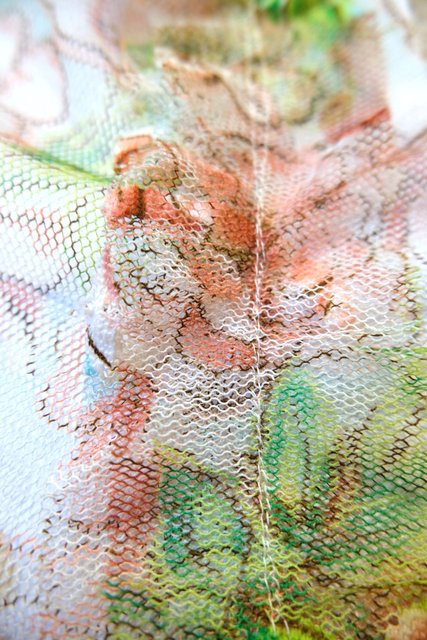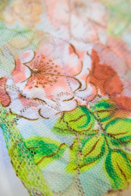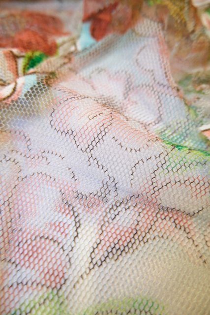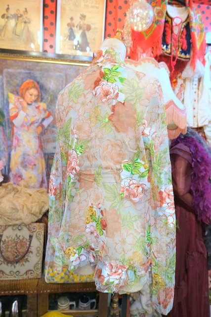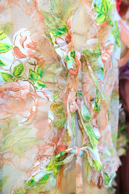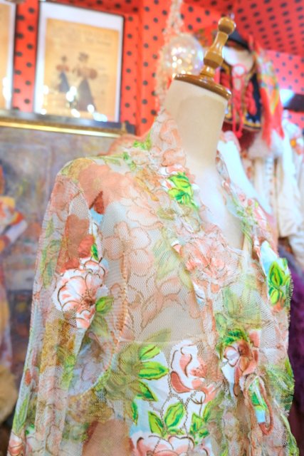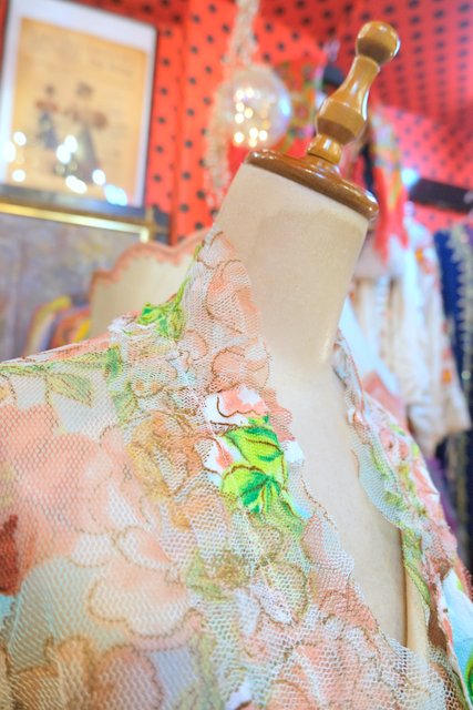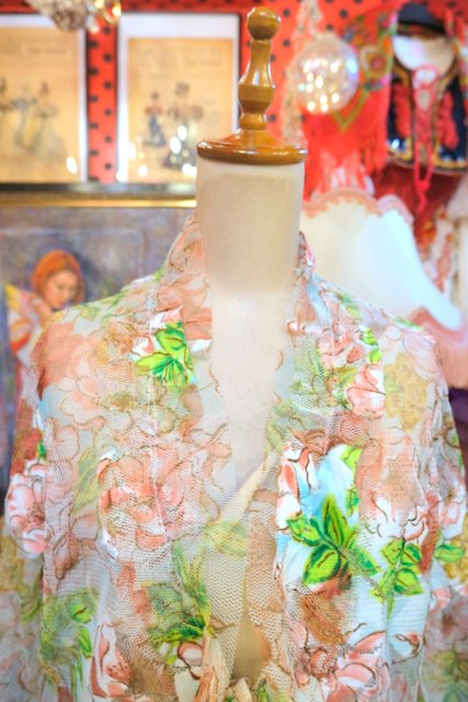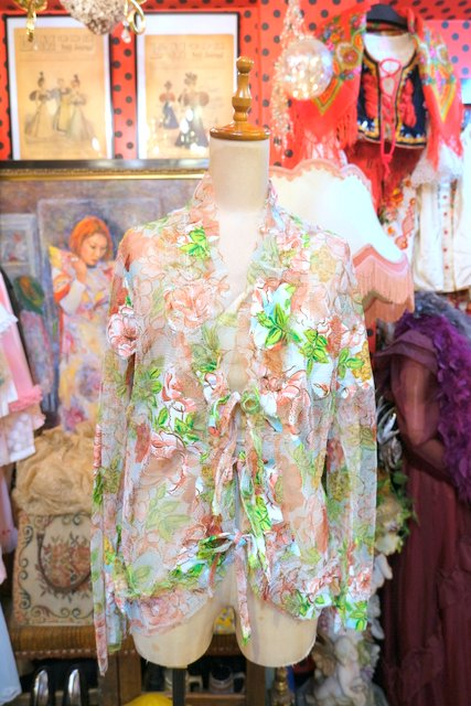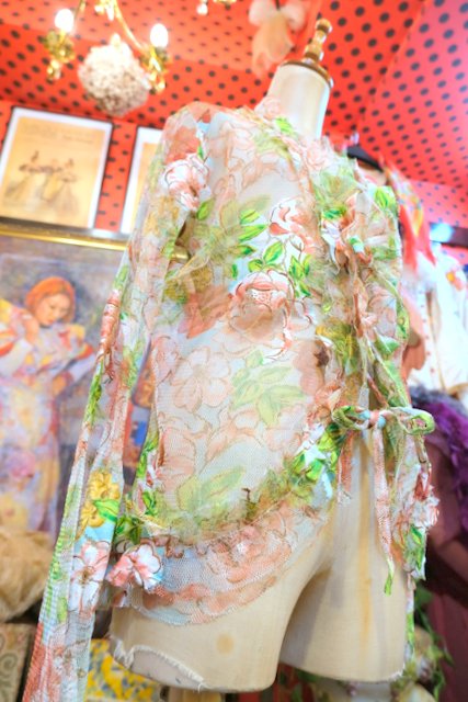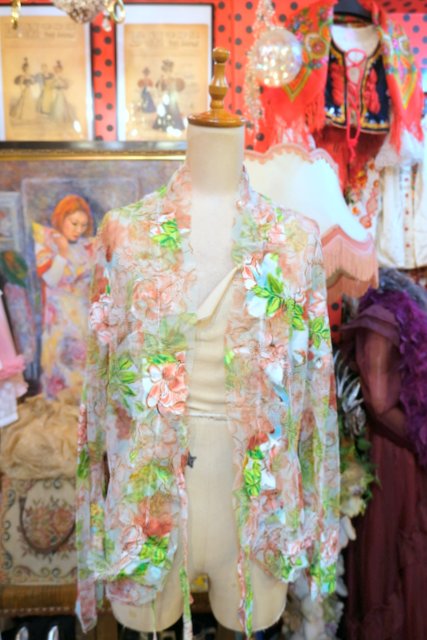 白、グリーン、ピンクのお花&リーフプリントメッシュにフリルや3段紐デザインが可愛らしい1980年代頃のフランス製ヴィンテージカーディガン