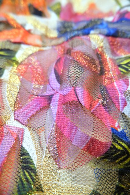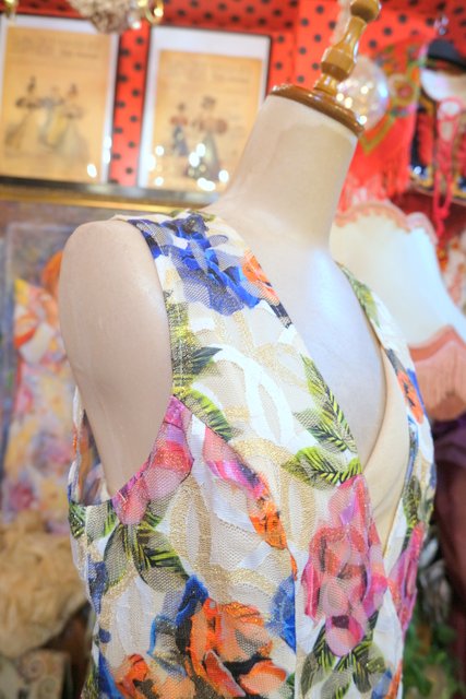 ゴールドラメ混じりの華やかな花柄プリント×背中やパンツの透け感が魅力的なヨーロピアンメタリックジャンプスーツ