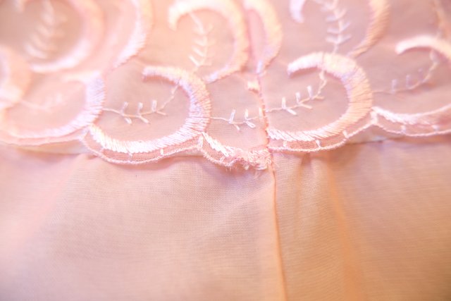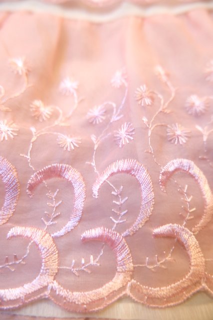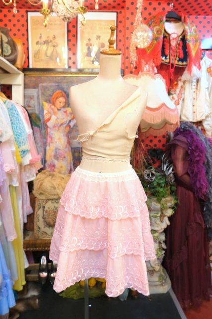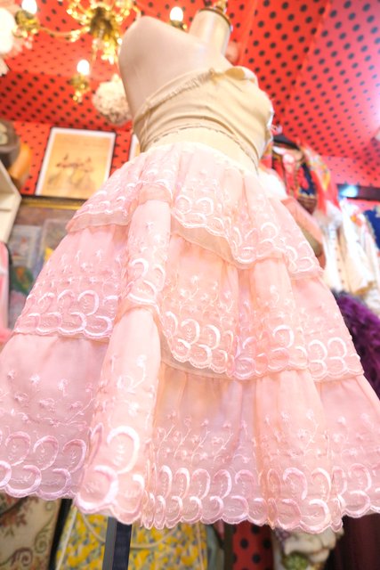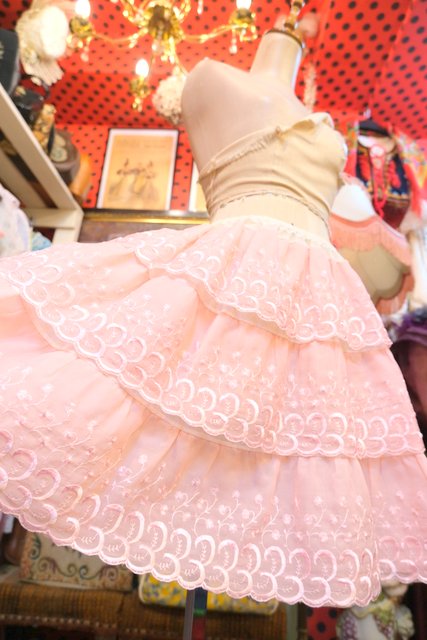 ガーリーな花柄刺繍入りの淡いピンクシフォン生地×3段ティアードデザインが魅力的な1970年代頃のヨーロピアンヴィンテージインナーチュールスカート
