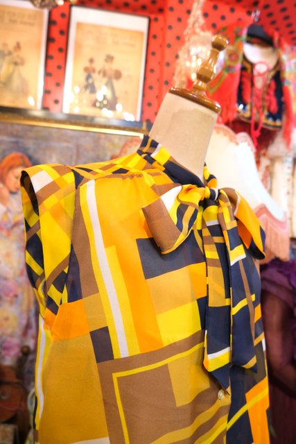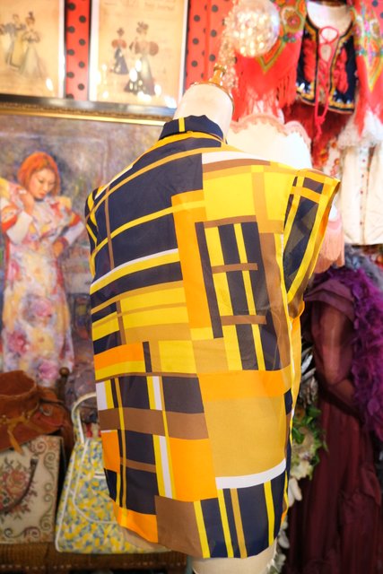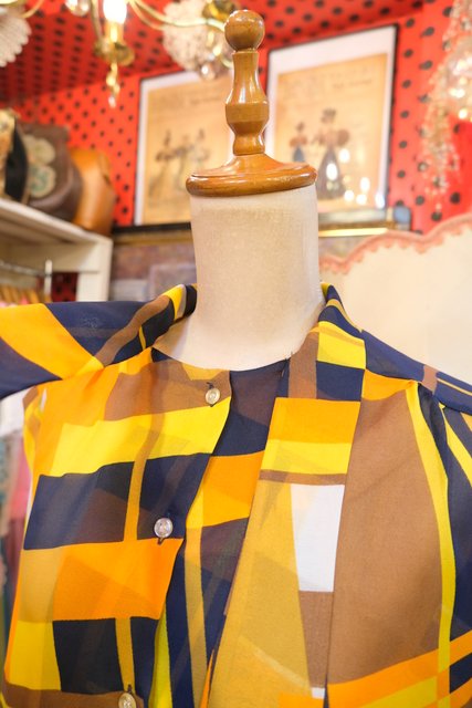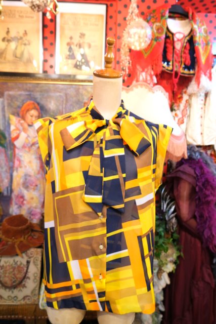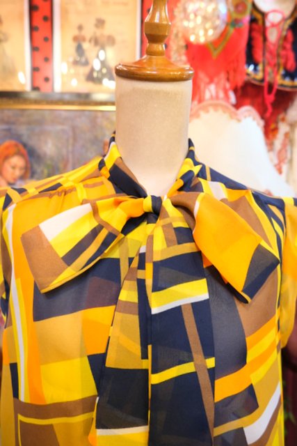 ネイビー×オレンジ×イエローのレトロなジオメトリック柄にリボンボウタイデザインが可愛らしい1970年代頃のフランス製ヴィンテージブラウス