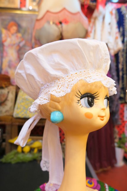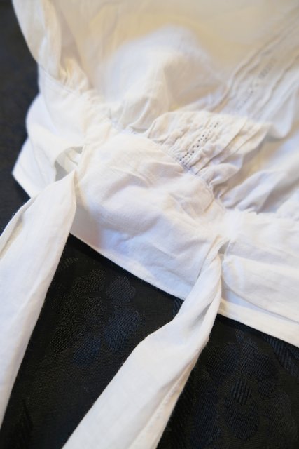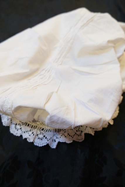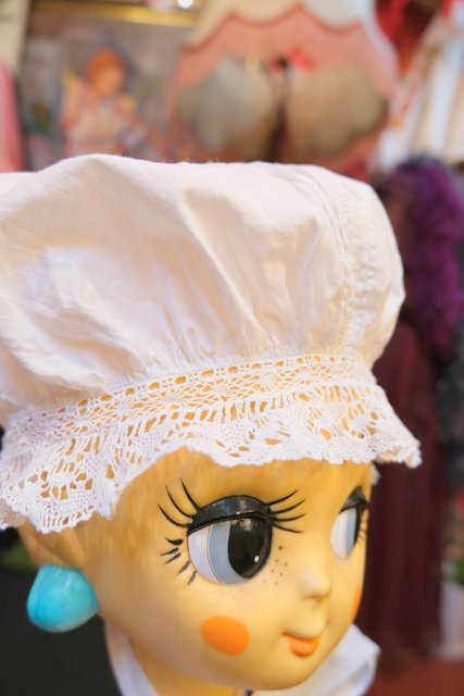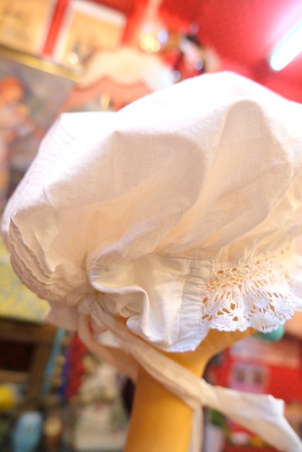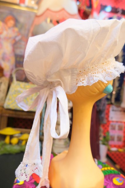 張り感があるコットン生地に繊細で華やかなレースやリボン紐が魅力的なフランスで見つけた1940~50年代頃のアンティークボンネット帽子