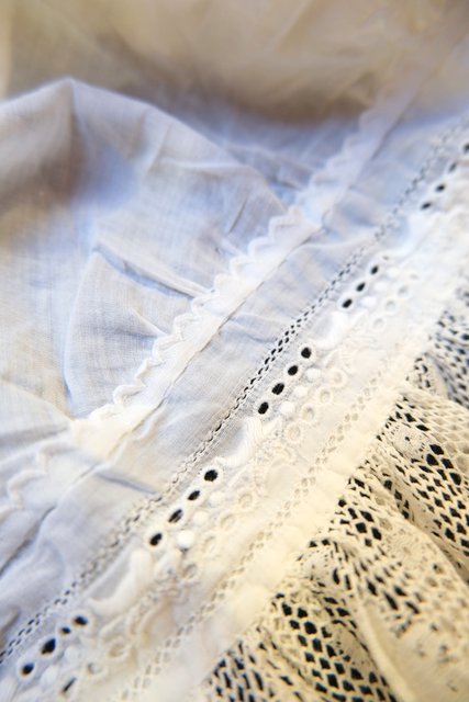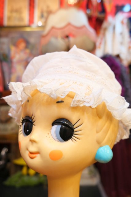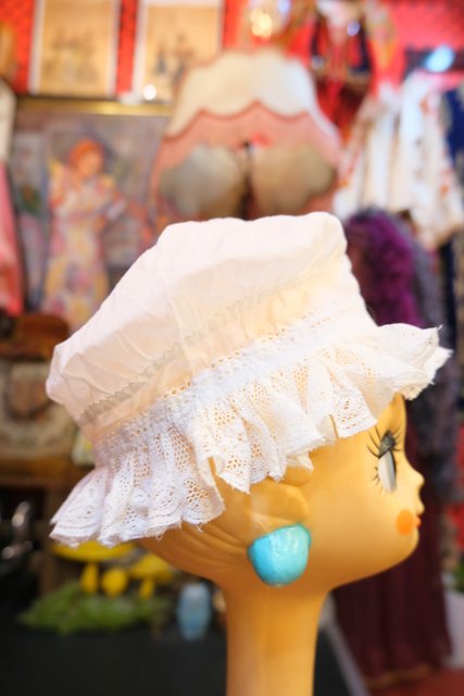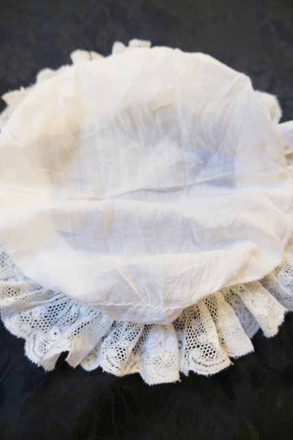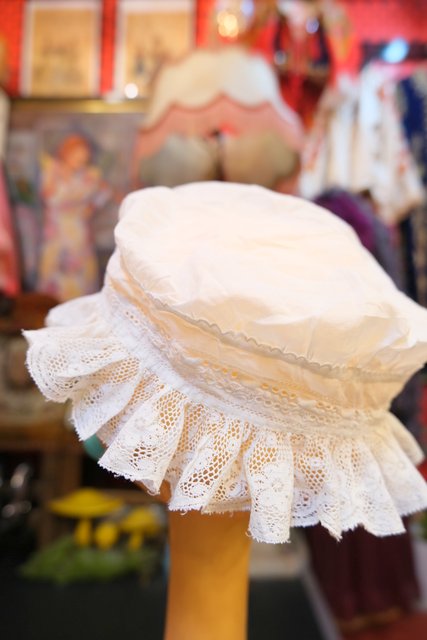 柔らかくほどよい透け感があるコットン生地に繊細で華やかなレースフリルデザインが魅力的なフランスで見つけた1930~40年代頃のアンティークボンネット帽子