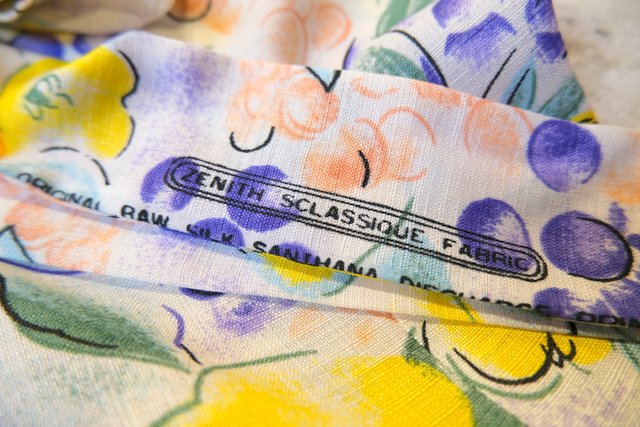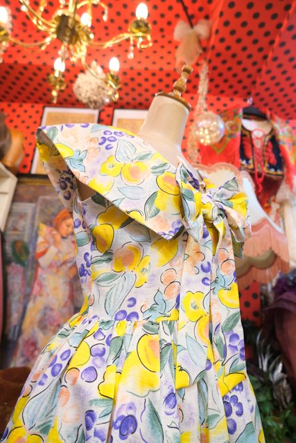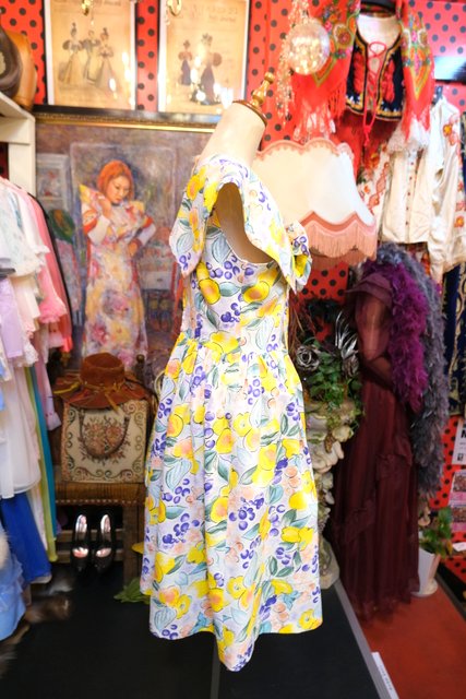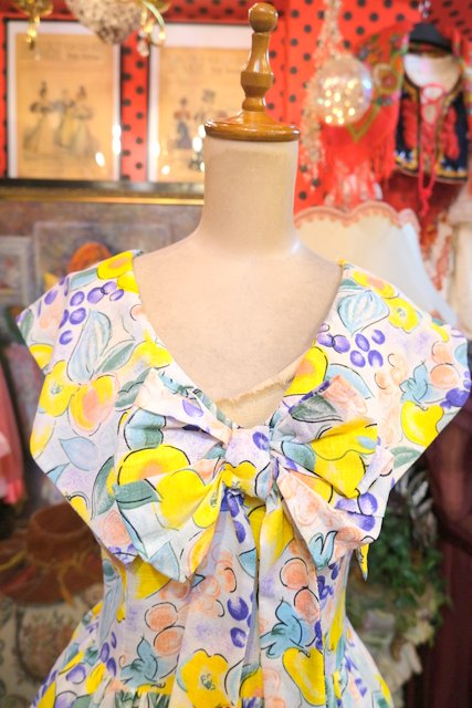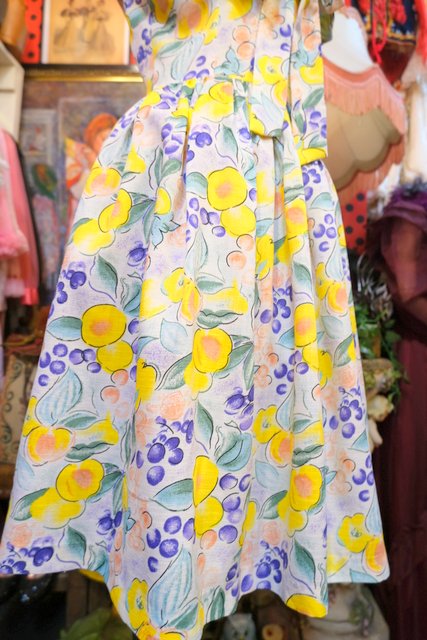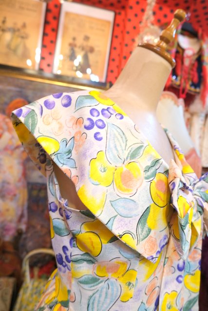 サラッとした肌触りでナチュラルな雰囲気が特徴のローシルク生地にフルーツのような総柄や大きなリボンがお洒落な1950年代頃のヨーロピアンヴィンテージワンピース